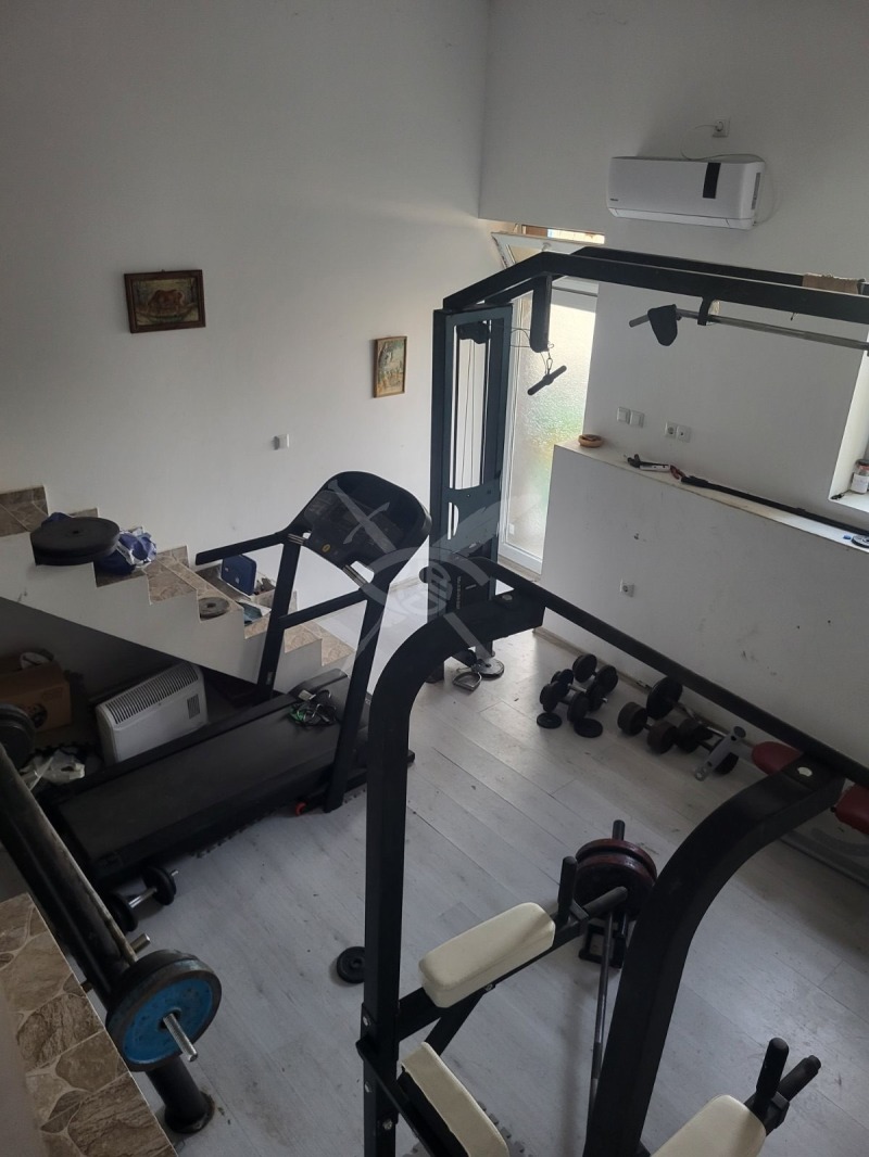 РАЗПРЕДЕЛЕНИЕ: Жилището разполага с площ 160кв.м., състои се хол с кухня, всекидневна, две бани и две спални, както и приземен етаж с изграден фитнес и складово помещение. Дворът е с площ 450кв.м.