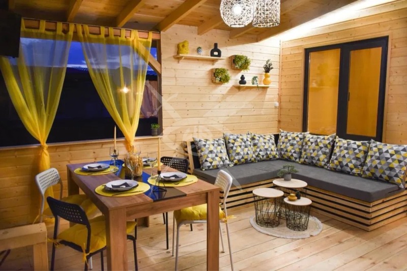 РАЗПРЕДЕЛЕНИЕ: Предлагаме уютен имот с разгъната площ от 50 кв.м., включващ веранда с кухня, хол, трапезария и тераса с винилови завеси. Вътрешната част разполага с две спални и баня с тоалетна, осигуряващи комфорт и практично разпределение за семейство или почивка.