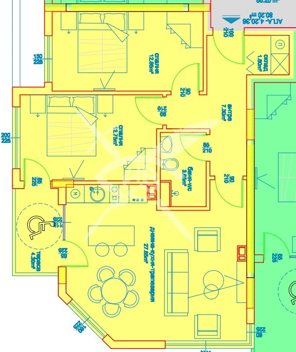 РАПРЕДЕЛЕНИЕ: Апартаментът разполага с площ от 80,20 кв.м., функционално разпределени в 2 спални, хол с кухненски бокс, антре и санитарен възел, мокро помещение и тераса.