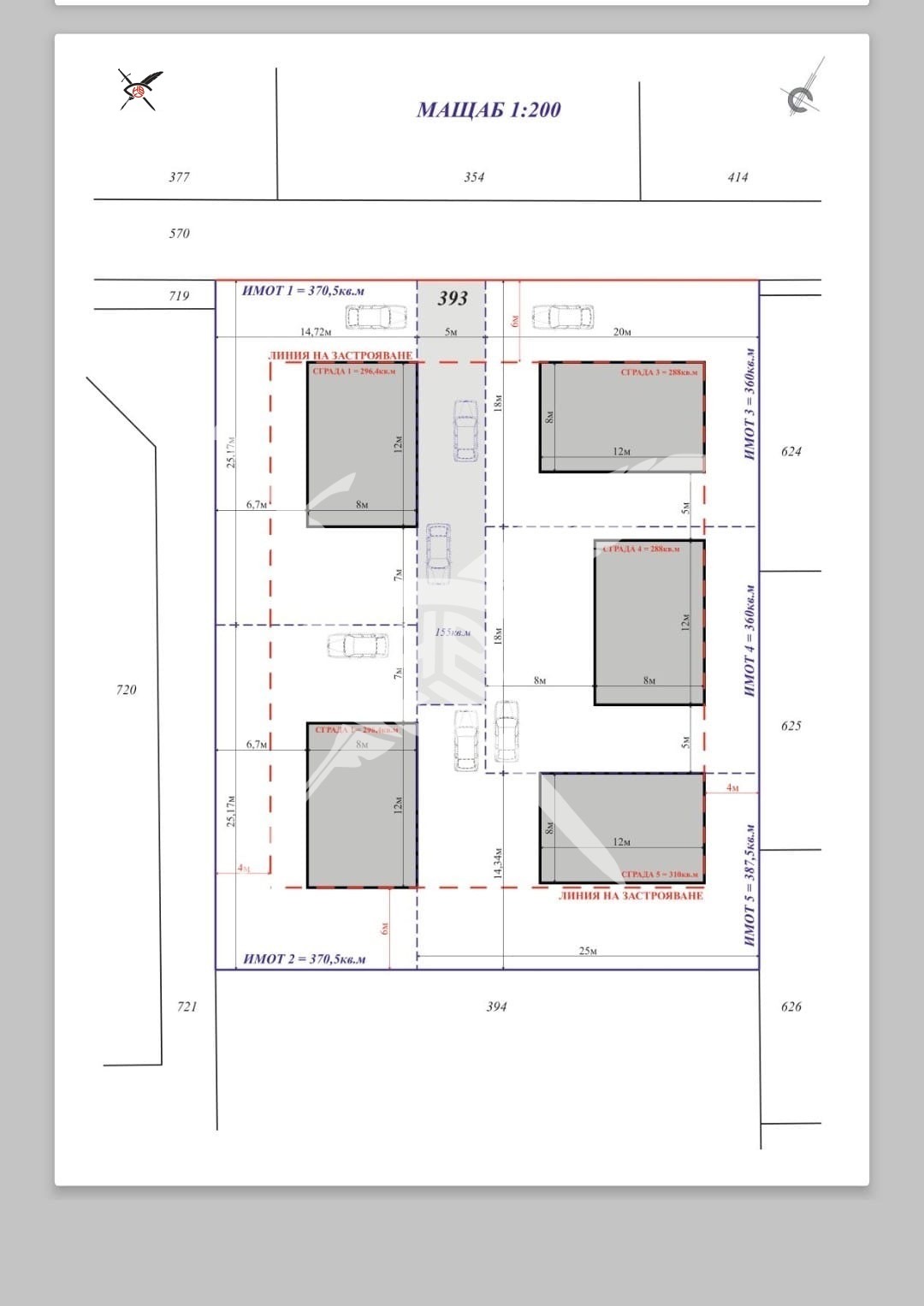 РАЗПРЕДЕЛЕНИЕ: Парцелът е с площ от 2000кв.м., има ПУП, предстои вкарване в регулация. На парцела може да се изгради комплекс от 5 еднофамилни къщи с РЗП от 288кв.м. до 310кв.м. Всяка къща ще разполага с дворно място от 370кв.м. С възможност за закупуване само на един парцел по избор.