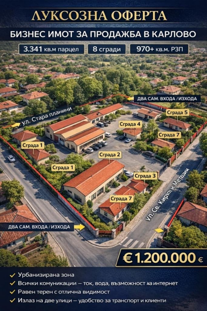 Имота се състои от осем сгради с обща застроена площ над 970 кв.м --- Недвижими имоти България предлага ексклузивно за продажба атрактивен бизнес имот с огромен инвестиционен потенциал, разположен в жилищен район на град Карлово, в подножието на Стара планина.