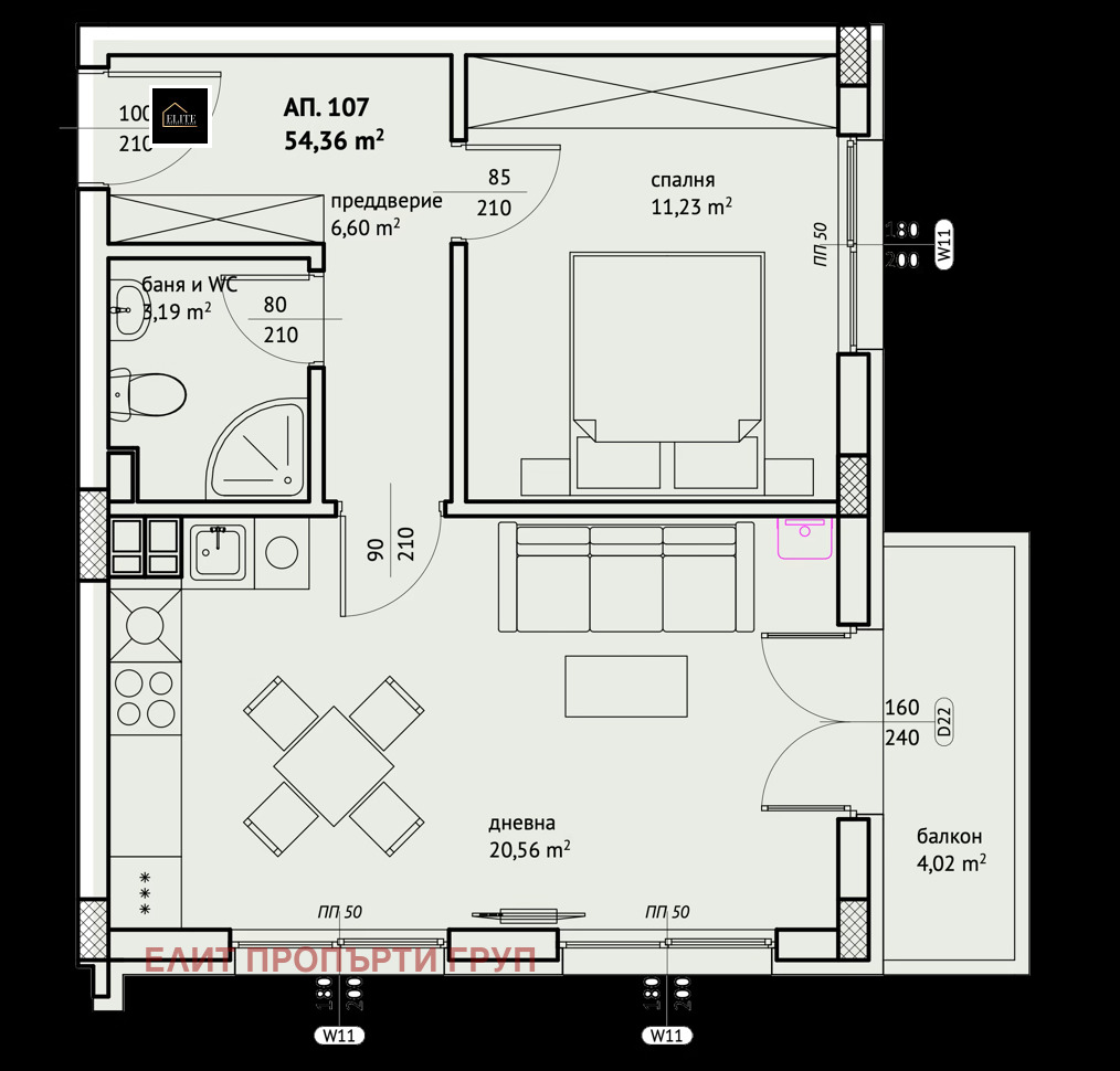Жилището е със застроена площ от 54 кв. м и се състои от антре, дневна стая с кухненска част, спалня, баня с тоалетна и балкон.