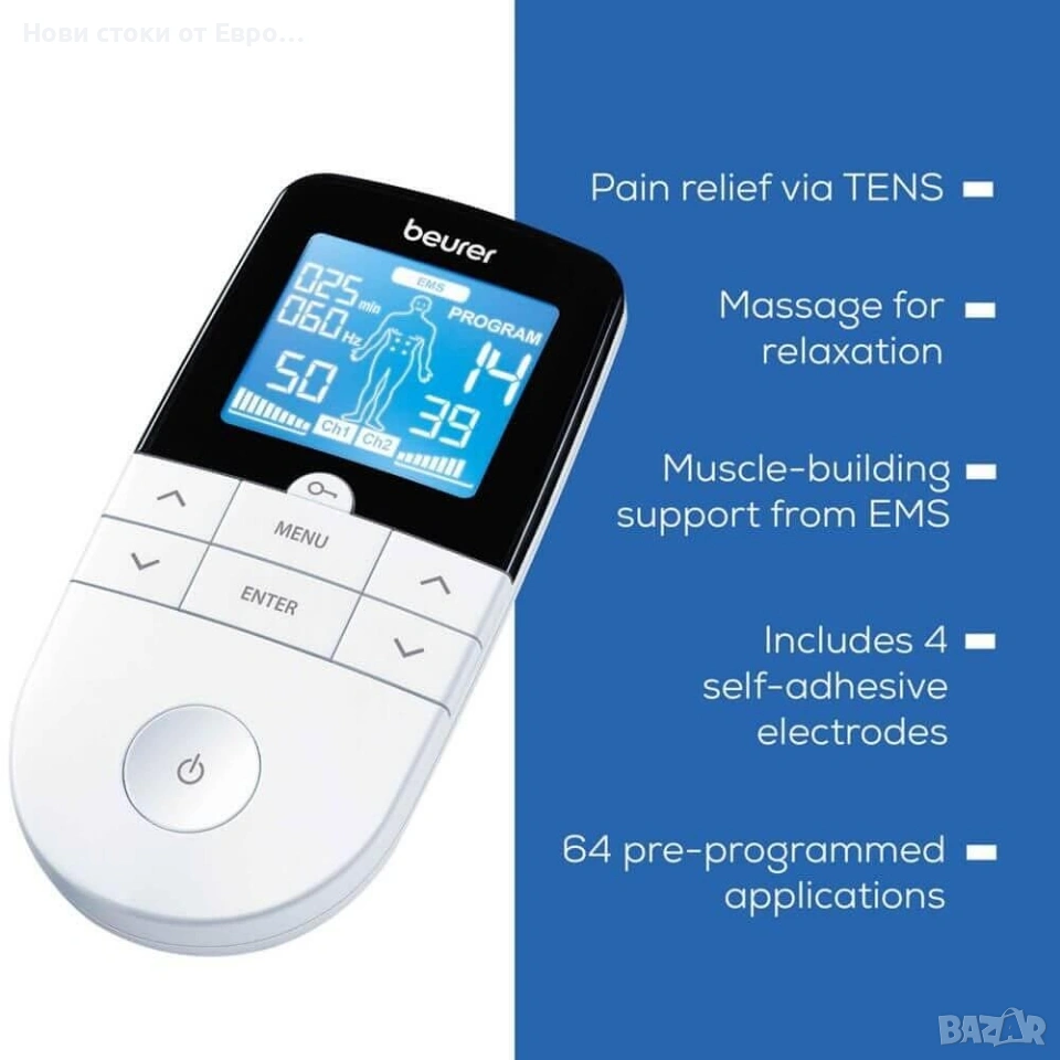 Масажор Beurer EM 49 е цифров TENS/EMS уред за мускулна стимулация. Цифровите TENS/EMS уреди принадлежат към групата на електрическите системи за стимулация. Те имат три основни функции, които могат да се използват заедно: Електрическа стимулация на нервните пътища (TENS); Електрическа стимулация на мускулната тъкан (EMS); Масажен ефект, генериран от електрически сигнали. Този уред е подходящ за употреба върху цялото тяло, има два независими канала за стимулация и четири самозалепващи се електрода. Има различни функции за подобряване на общото състояние, облекчаване на болката, поддържане на физически тонус, релаксация, активизиране на мускулите и борба с умората. Възможността за отделна настройка на интензивността на всеки канал ви позволява да третирате две отделни области на тялото едновременно, което ви спестява време. Освен това уредът има 4 самозалепващи се гел електроди, 6 програми на работа и LCD дисплей със синя подсветка.