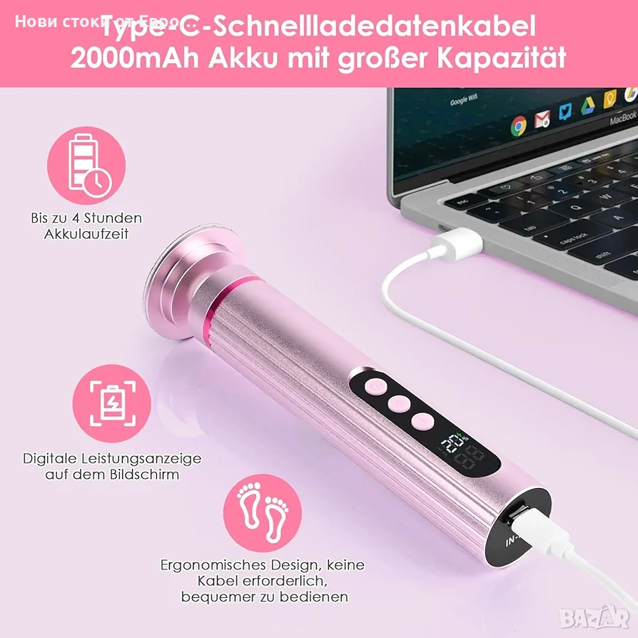 Не са необходими кабели и е удобен за пътуване: високопроизводителна батерия с капацитет 2000 mAh с дисплей за процент на батерията гарантира 4 часа безжична работа - идеален за по-дълги спа сесии! Електрическият уред за премахване на мазоли се зарежда чрез модерен TYPE-C порт (5V/12V) дори по време на употреба. Ултракомпактен (15,5 см) се побира във всяка чанта за пътуване като вашия мобилен комплект за педикюр. Край на ограниченията с кабелите - насладете се на грижа за краката, готова за салон, в самолета, хотела или градината! Ергономичен дизайн на дръжката и сменяема шлифовъчна плоча: биомедицински оптимизираната геометрия на дръжката на комплекта за маникюр предотвратява умората при продължителна употреба. За тези, които искат да си направят маникюр или педикюр, предлагаме достатъчно резервни подложки, за да можете да извършите пълен цикъл на грижа, без да се налага да купувате допълнителни подложки.