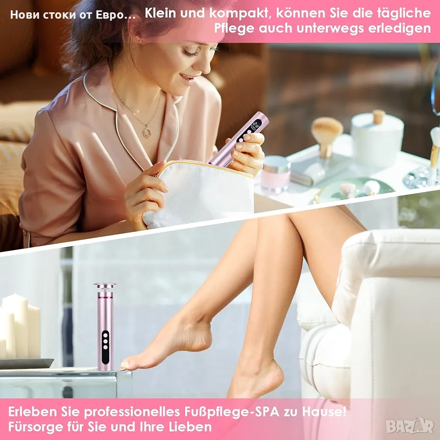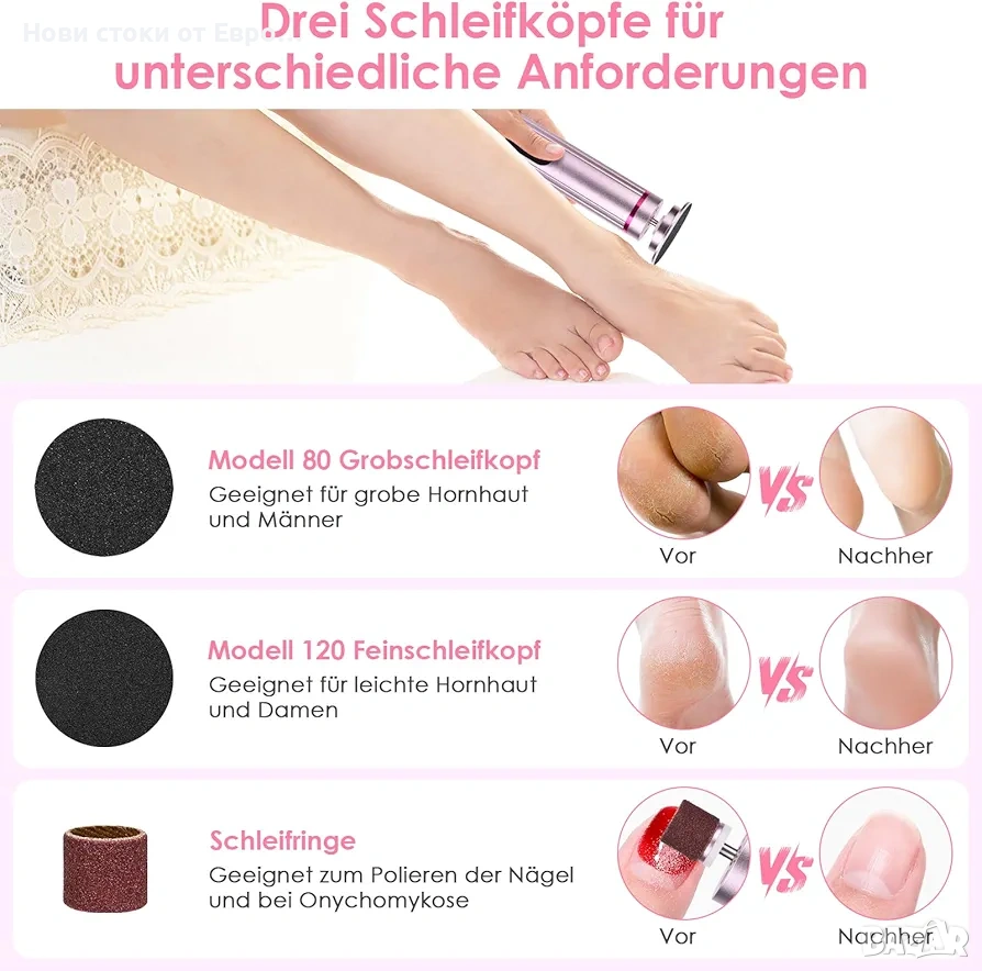 Девет скорости за регулиране и незабавни резултати: този професионален комплект за грижа за краката революционизира рутината за грижа за тялото. Специализиран в премахването на мазоли по краката, той действа и като помощно средство за премахване на лак за нокти, полиратор и оформяща подложка за нокти. Има девет различни скорости от 1-ва до 9-та, които можете да изпробвате! Можете да регулирате скоростта на полиране на различни нива в зависимост от степента на втвърдяване на мъртвите кожни клетки, мазолите и др.