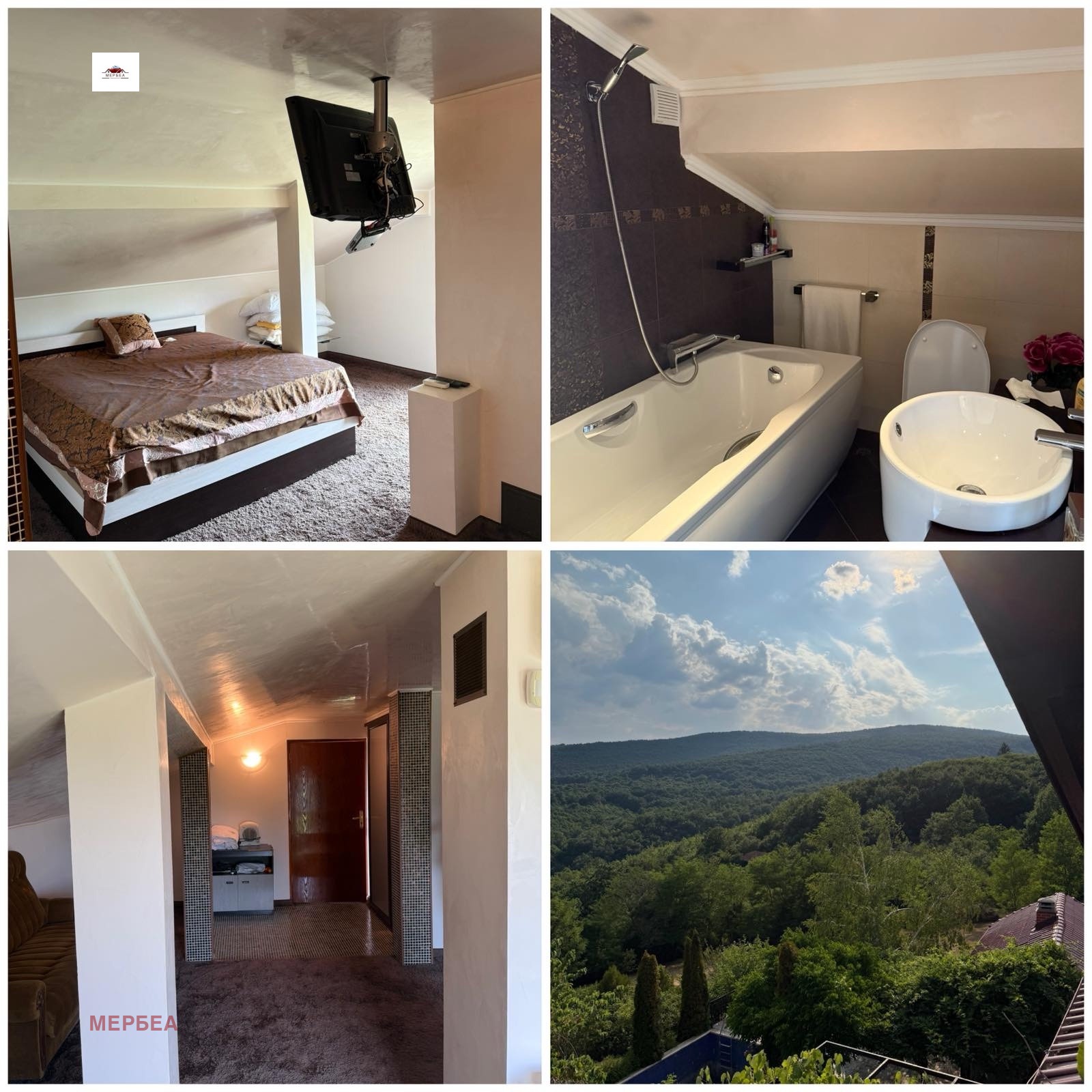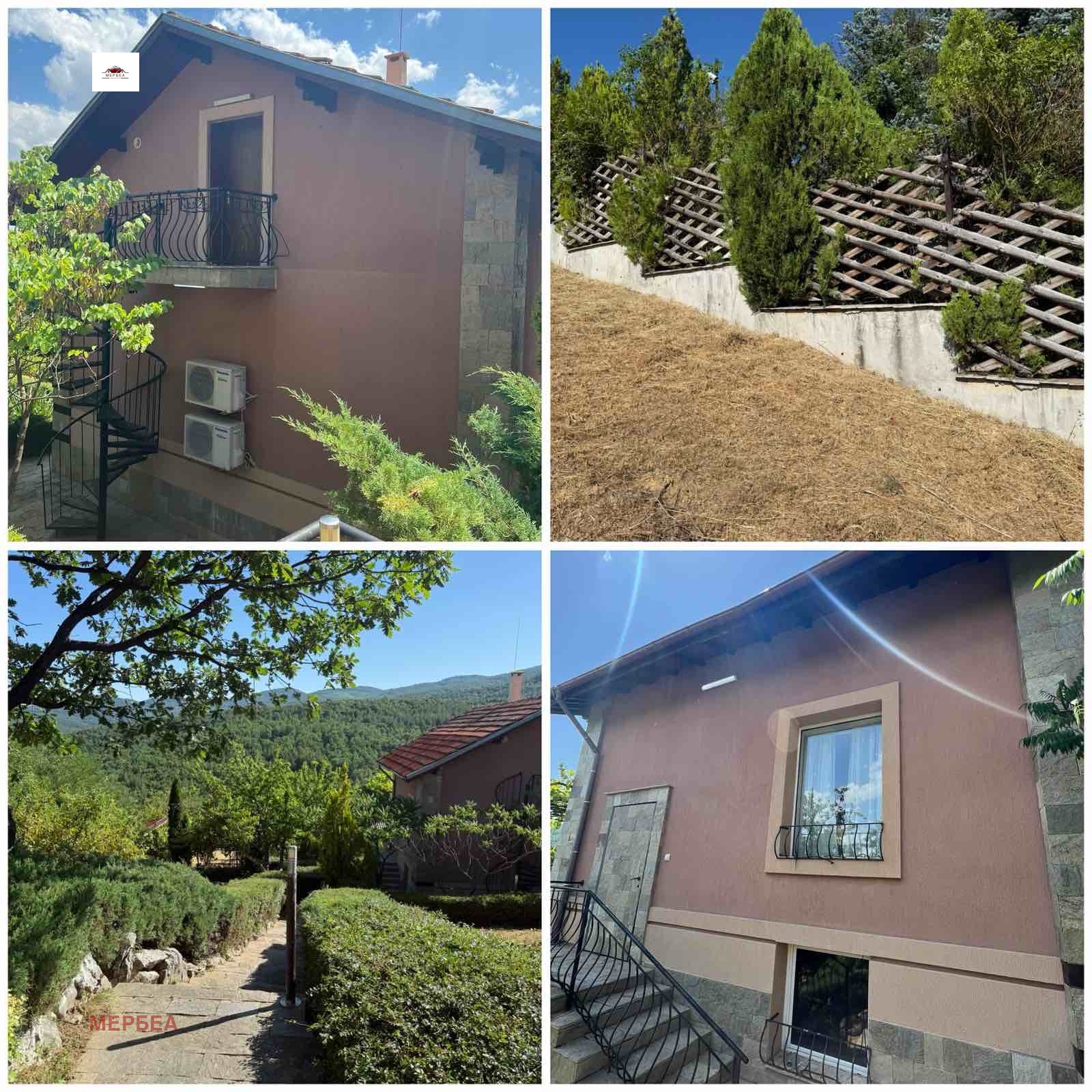 Основна сграда- Двуетажна къща е със следното разпределение: на кота 0 с два самостоятелни входа има кухненски бокс,всекидневна и WC.На 1-ет. две самостоятелни спални със собствени санитаррни възли и тераса с ослепителна гледка.Външна вита стълба води до таван, който е обособен в огромна спалня, баня с тоалетна и тераса.Всички постройки са съвременно ремонтирани, обзаведени и готови за ползване. Отоплението е решено с камина на пелети. Водата е от 3 сонди отведена в хидрофор.
