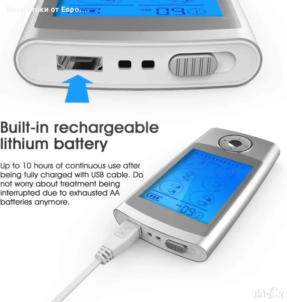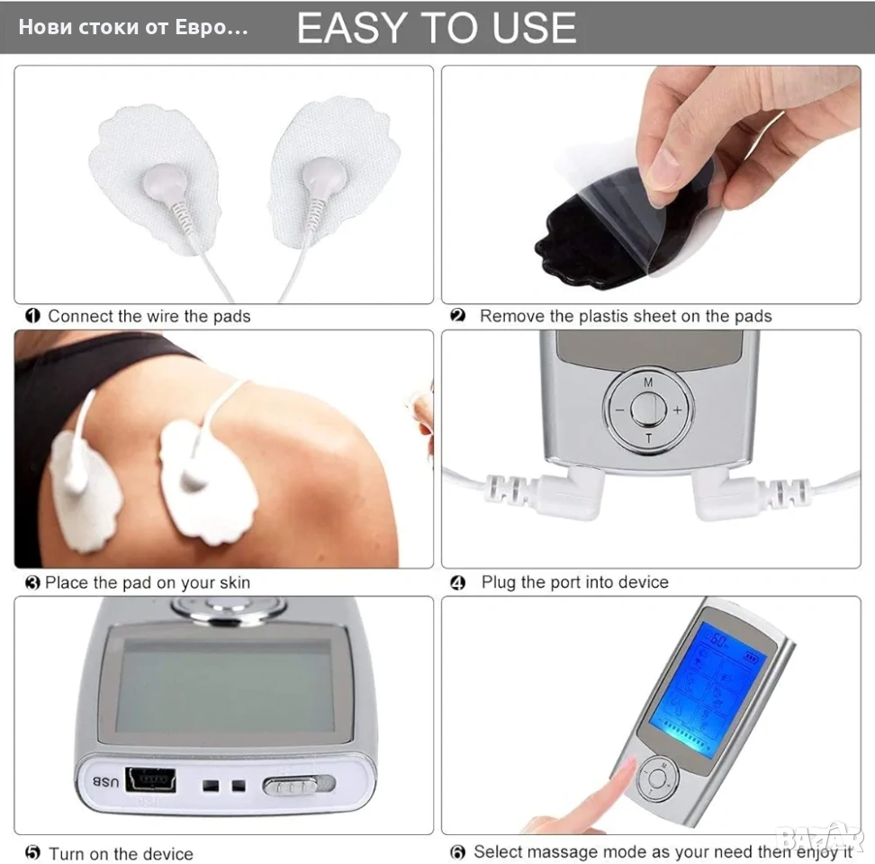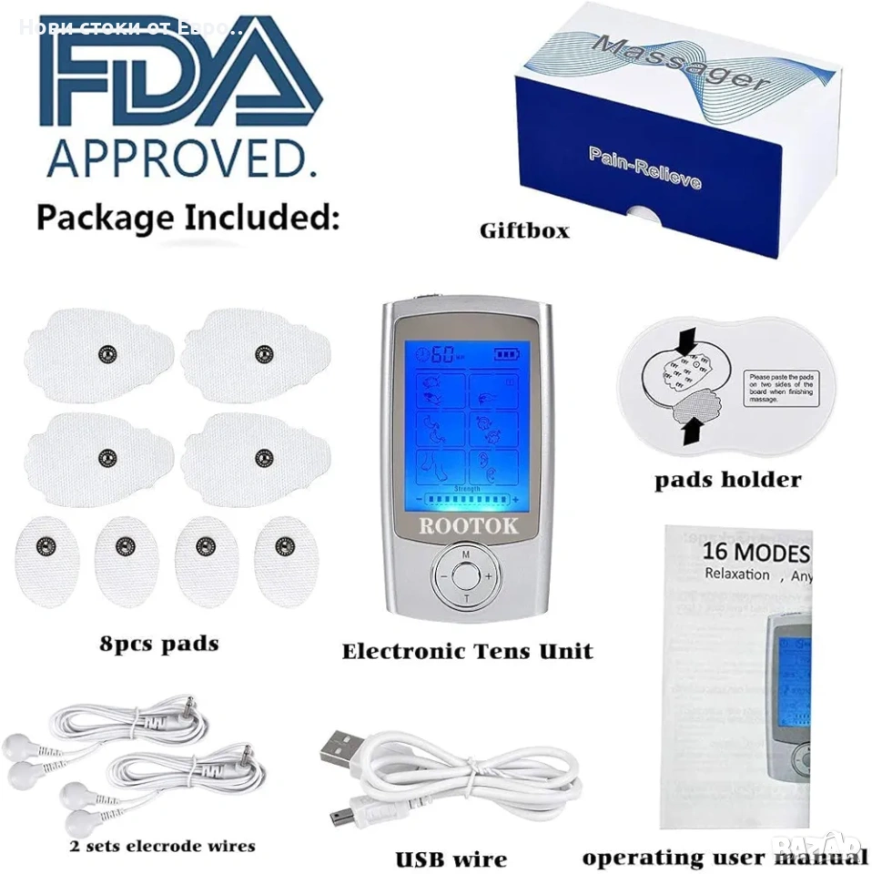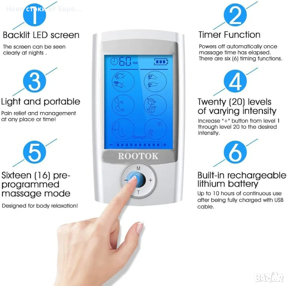 Електростимулатор ROOTOK: Транскутанна електрическа нервна стимулация (TENS), електрическа мускулна стимулация (EMS), релаксиращ масаж 2 отделни, регулируеми канала с 8 включени самозалепващи се електрода 16 предварително програмирани режима Голям, лесен за употреба LCD екран със синя подсветка Вградена презареждаща се литиева батерия, лесна за употреба и зареждане