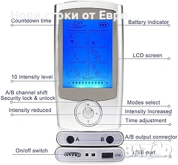 TENS дигитален електр мускул стимулатор,EMS,LCD екран,2 канала,8електрода