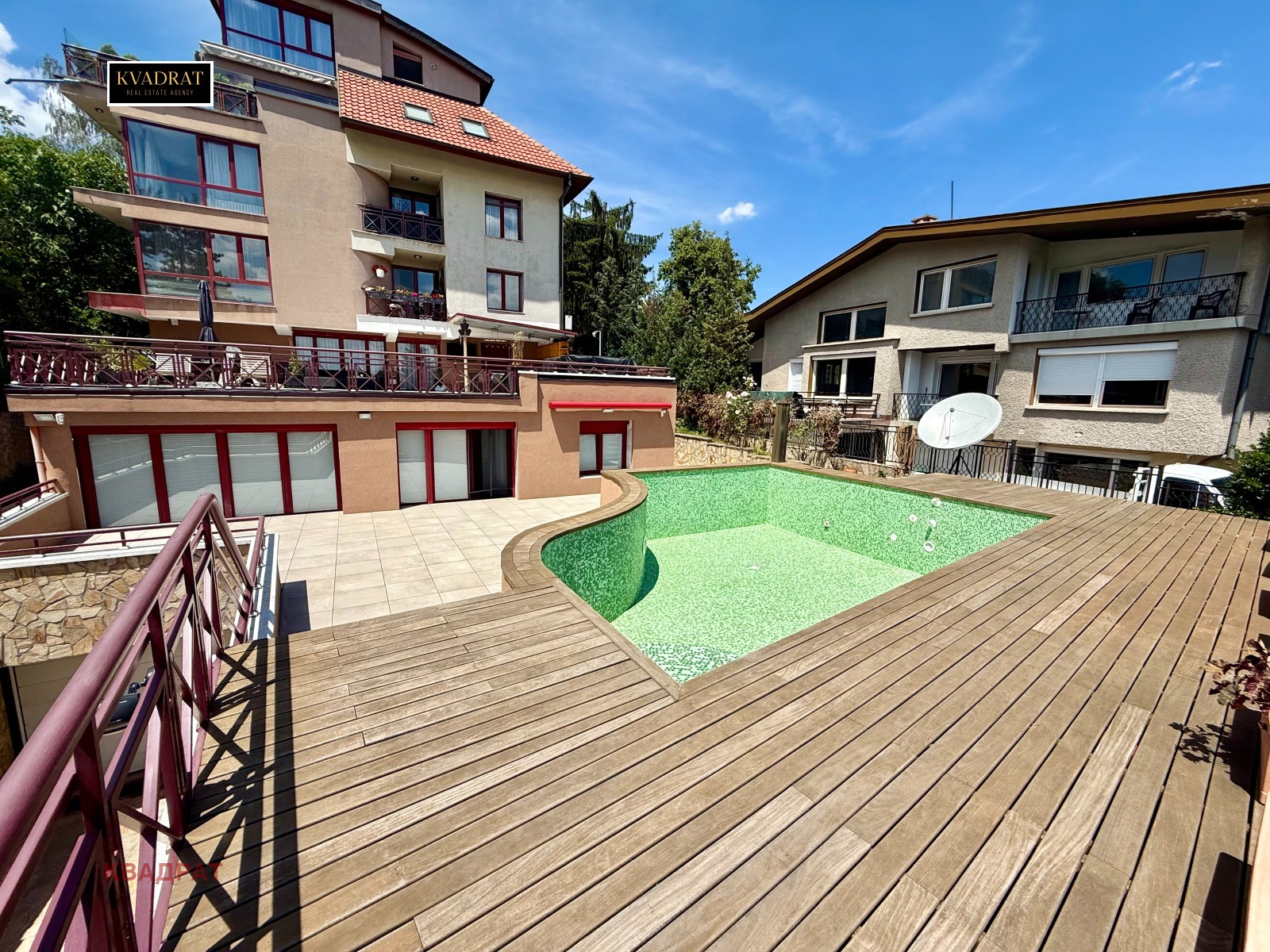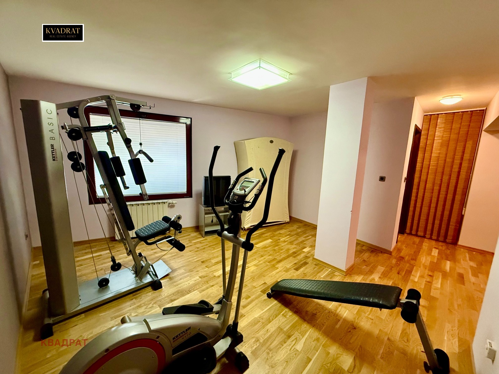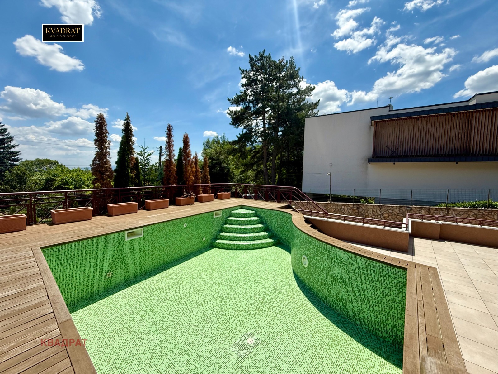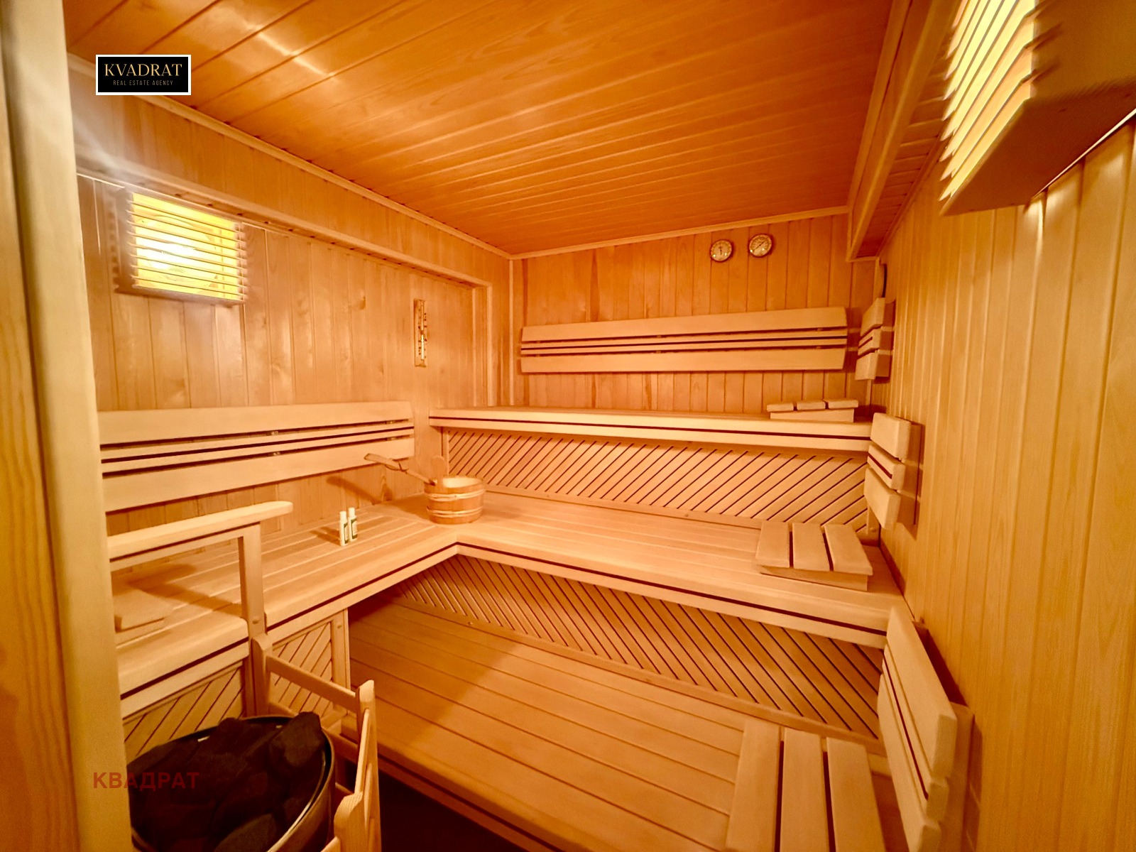 Родителската спалня разполага със собствен санитарен възел, а жилището предлага още сауна, фитнес зона и голяма тераса с външен подгряем басейн, подходящ за използване през зимния сезон.