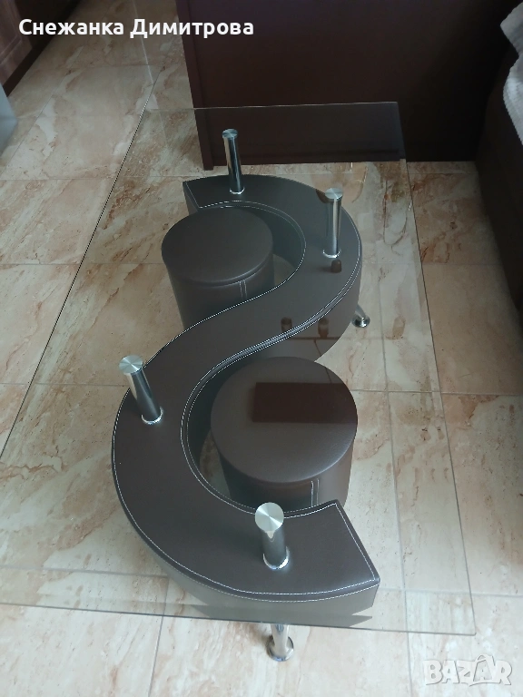 стъклен плот и метален корпус.Основата е облицована с изкуствена кожа.Има и 2
