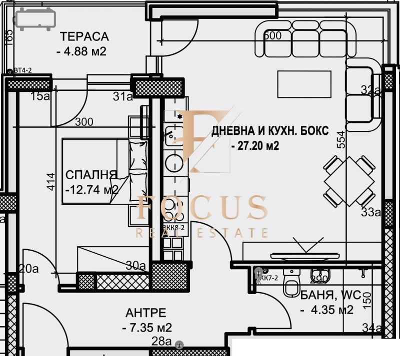 Апартаментът е с обща площ от 80,58 кв.м. със следното разпределение: антре, хол с кухненски бокс, спалня, баня с тоалетна, тераса.