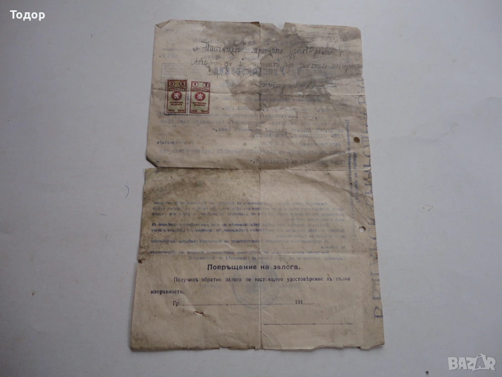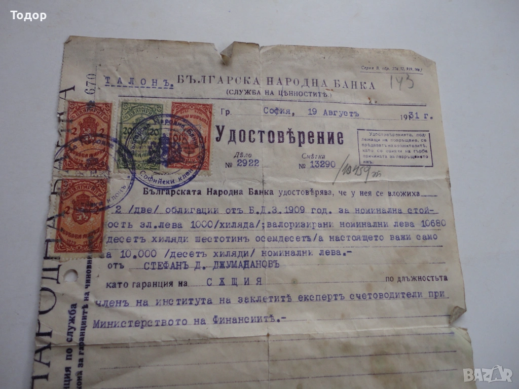 Царски БНБ документ 1931 гербови марки → Обява 53323463