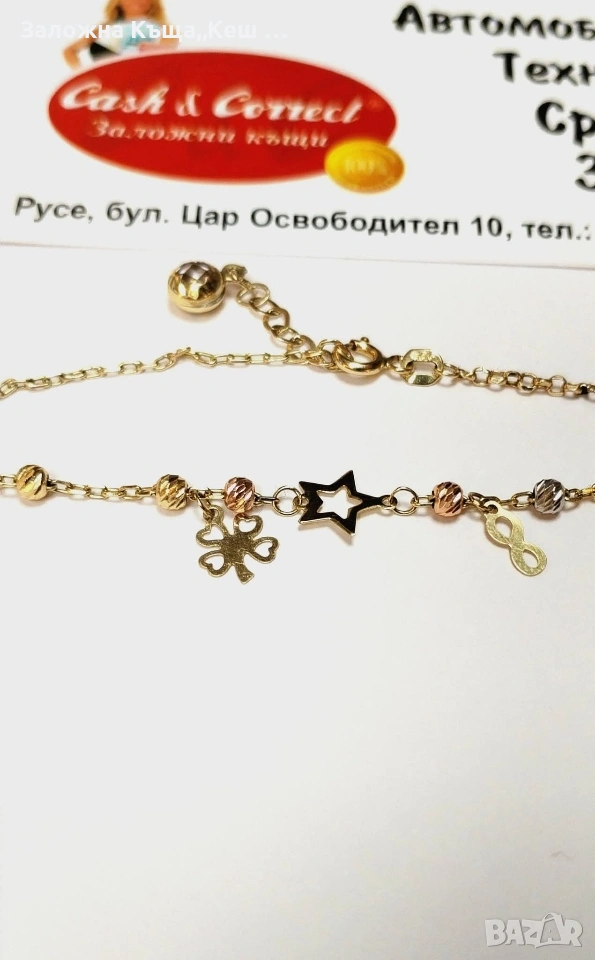 Златна дамска гривна 14К.Тегло 2.73 гр.Дължина 19 см.Цена 246 €. → Обява 53323538