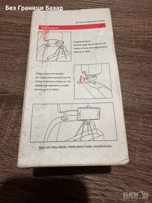 Практичен автомобилен държач за телефон, който се монтира на подглавника на седалката. Комбинира стойка за смартфон до 6 инча и здрава кука за чанти, раници или покупки. Въртящ се дизайн, лесен монтаж без инструменти и товароносимост до 10 кг. Идеален за поддържане на ред в автомобила.
