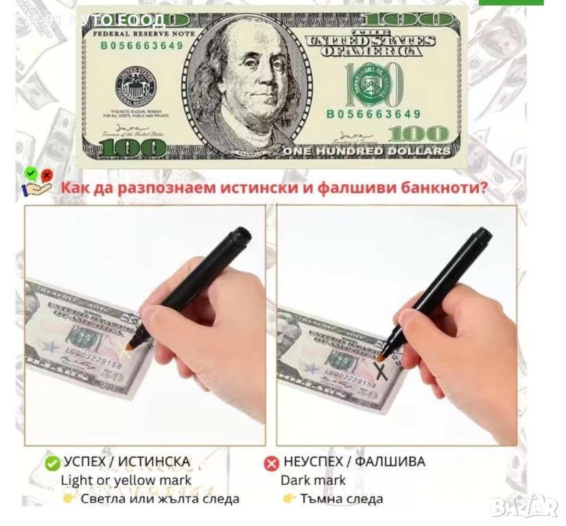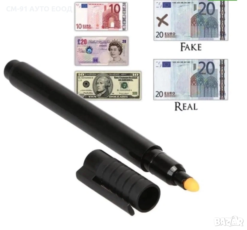 Писалката работи чрез специално мастило, което реагира с хартията на банкнотата: