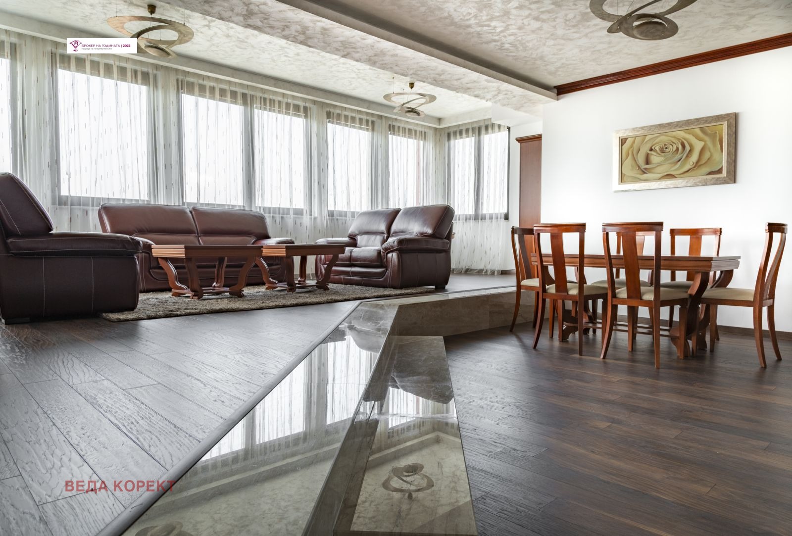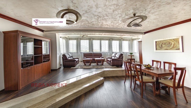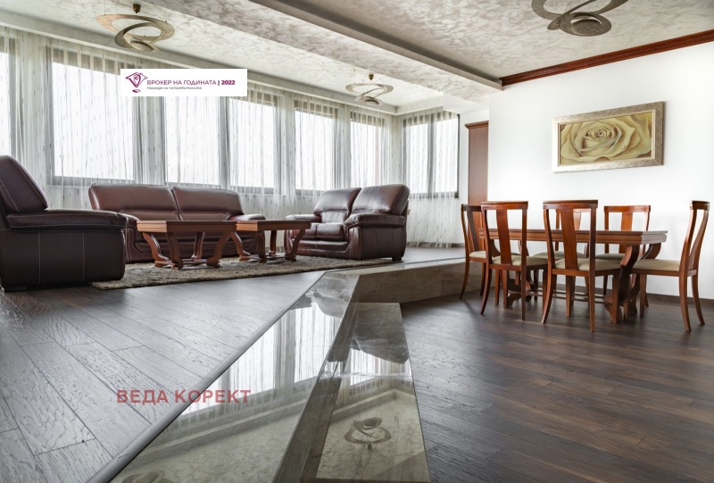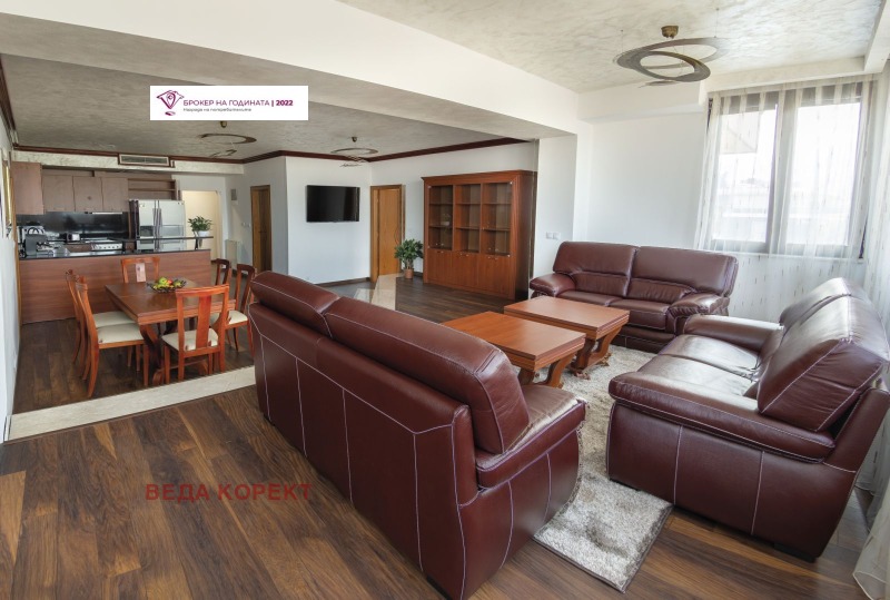 5-стаен апартамент под наем в затворен комплекс в район Градина 🏡, площ 213 кв.м, разположен на 4-ти етаж 🏢, напълно обзаведен 🛋️, с включено паркомясто 🚗🅿️. Имотът се намира в модерен жилищен комплекс с денонощна охрана и видеонаблюдение 📹👮♂️, осигуряващ спокойствие, сигурност и комфорт.