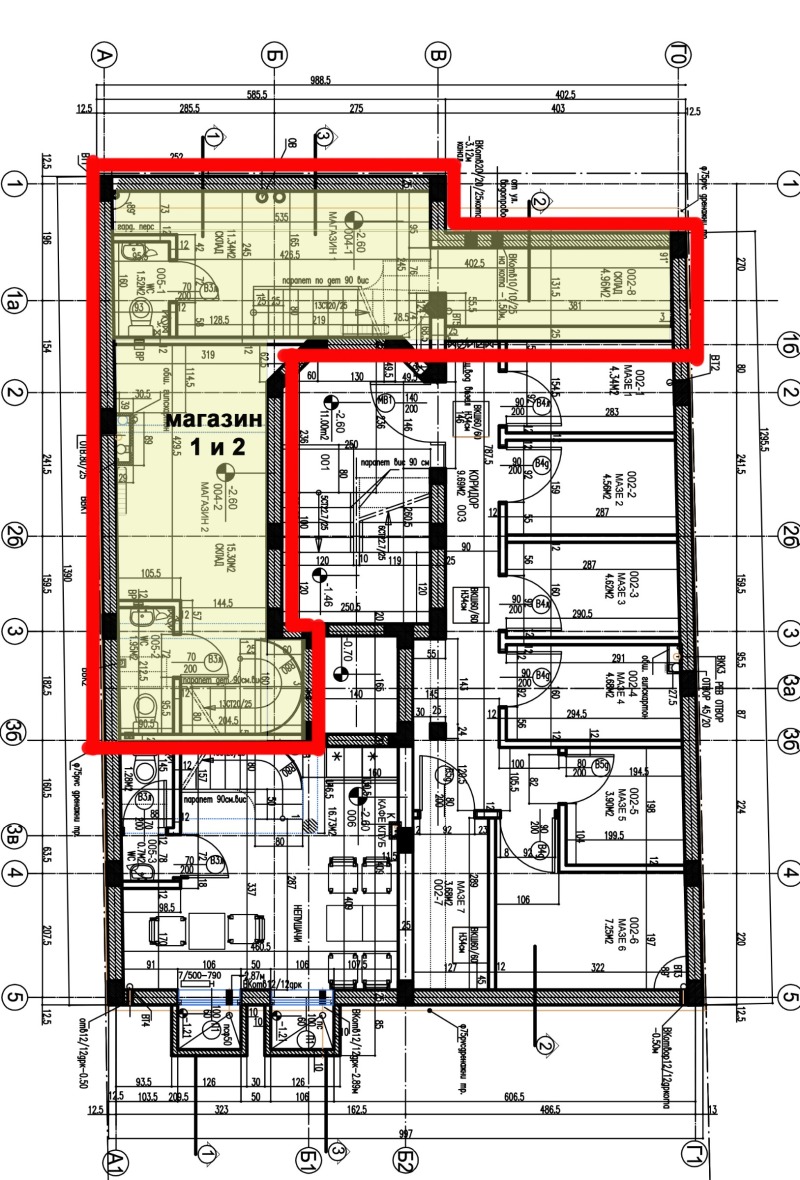 Помещението се състои от Магазин 1 и магазин 2 от чертежите, които ще бъдат обединени след пускане на сградата в експлоатация.