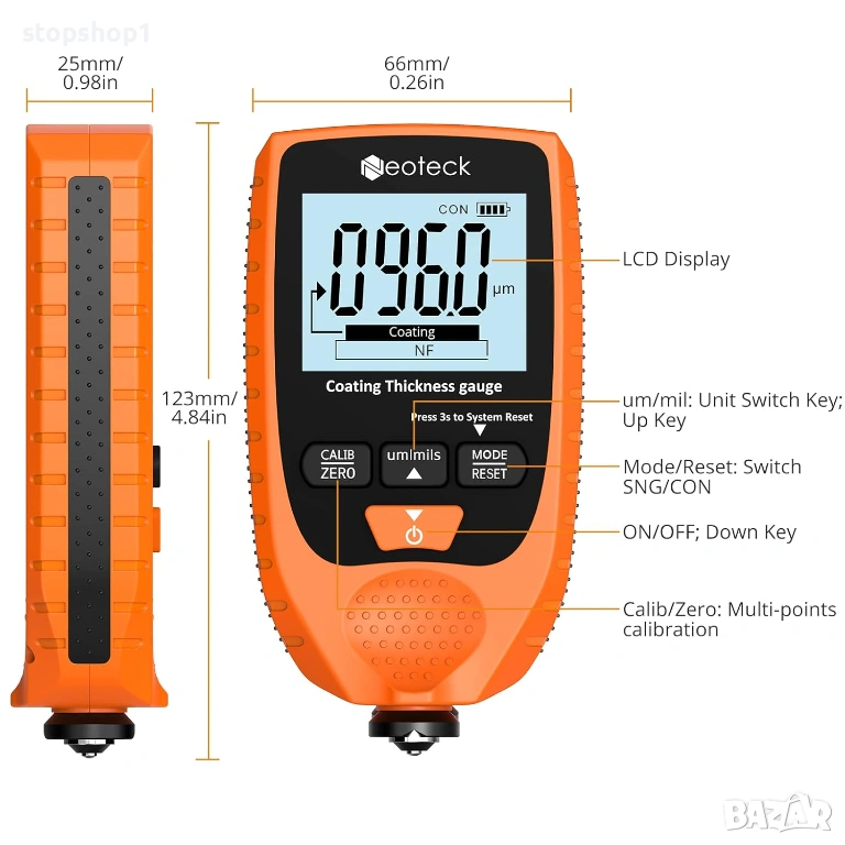 - ЛЕСНО ЗА ЧЕТЕНЕ - Големият LCD дисплей показва вида на метала, режима на работа, номера, състоянието на батерията и показанията в µm или mil