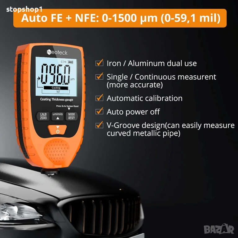 - Автоматично отчитане: проектирано с двойна технология, осигурява автоматично разпознаване на черни и цветни метали, което може да се използва за измерване на дебелината на боята на автомобилното покритие без разрушаване.
