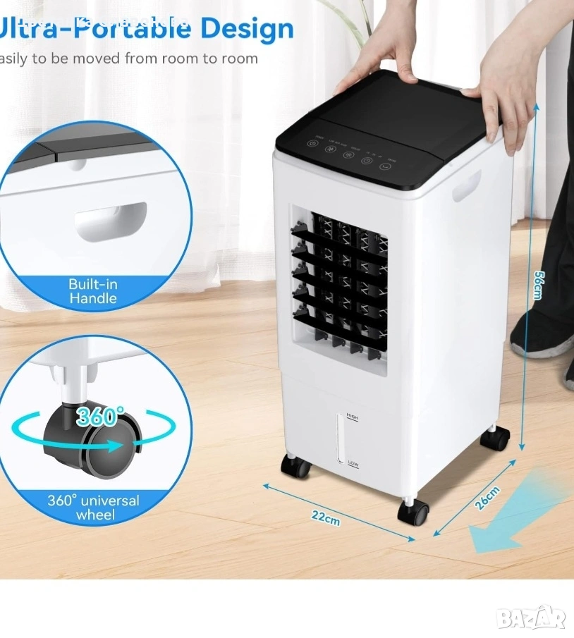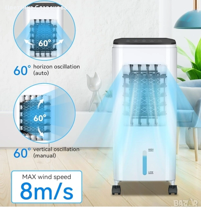 Висока ефективност и енергоспестяване: с водеща в индустрията технология за водопадно охлаждане с помпа, въздушният охладител Bigalter може бързо да филтрира и охлади горещия въздух в помещението, след което лопатките на вентилатора могат автоматично да се завъртят на 60° (хоризонтална посока) или ръчно да се регулират на 60° (вертикална посока), за да разпределят бързо студения въздух под множество ъгли в цялото помещение. Тази икономична охладителна система има само 60W и е идеална за помещения, които не изискват скъпи климатици.