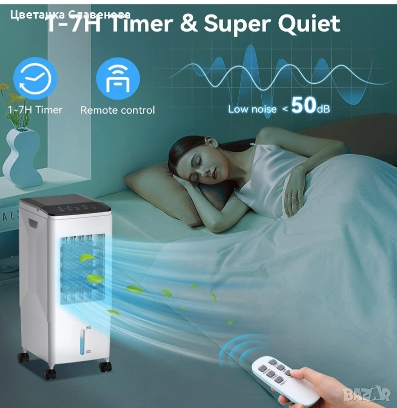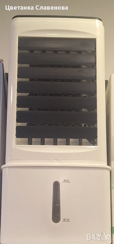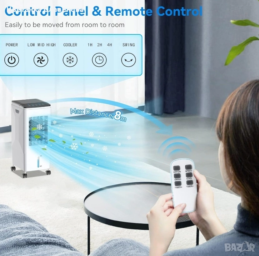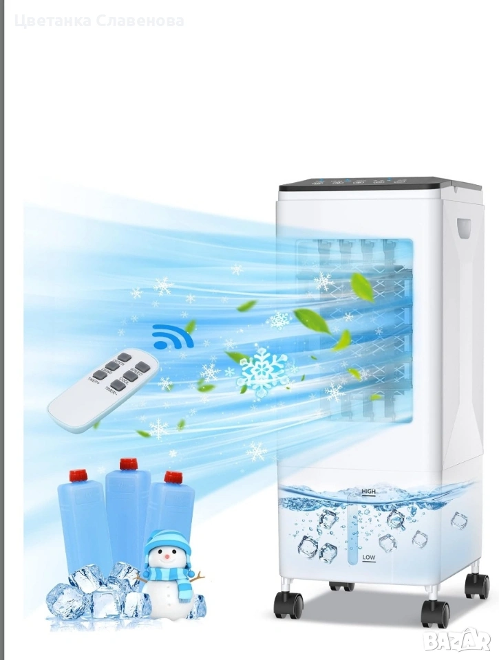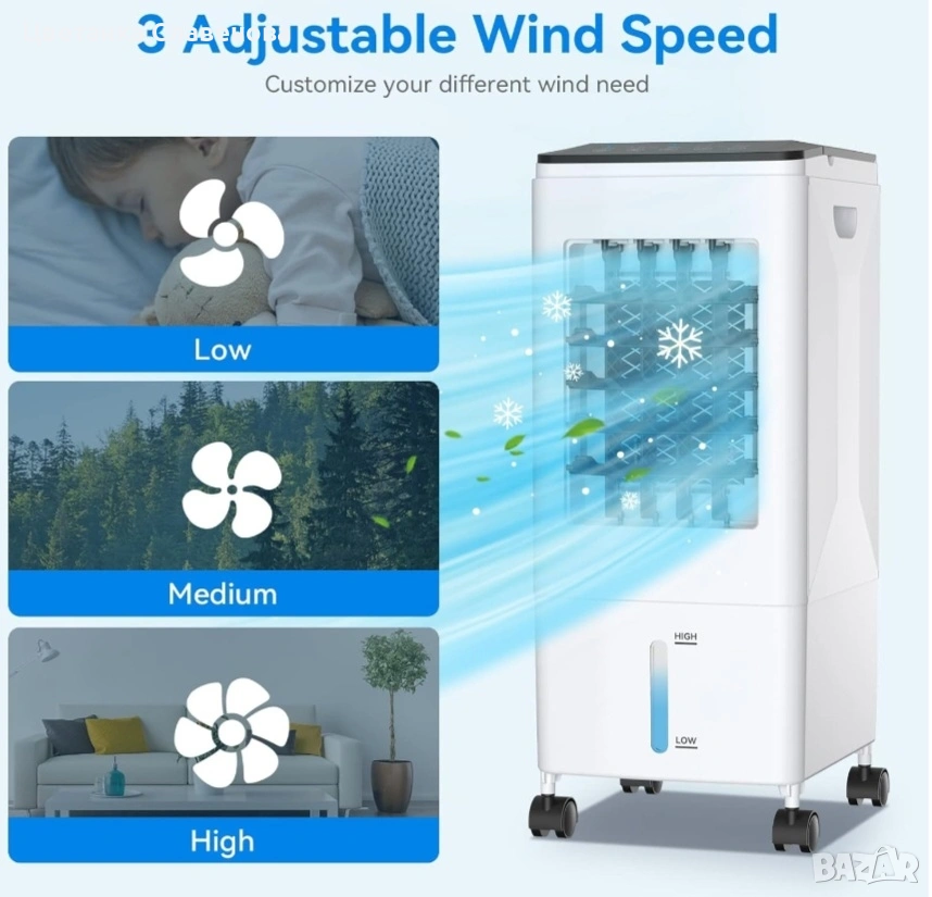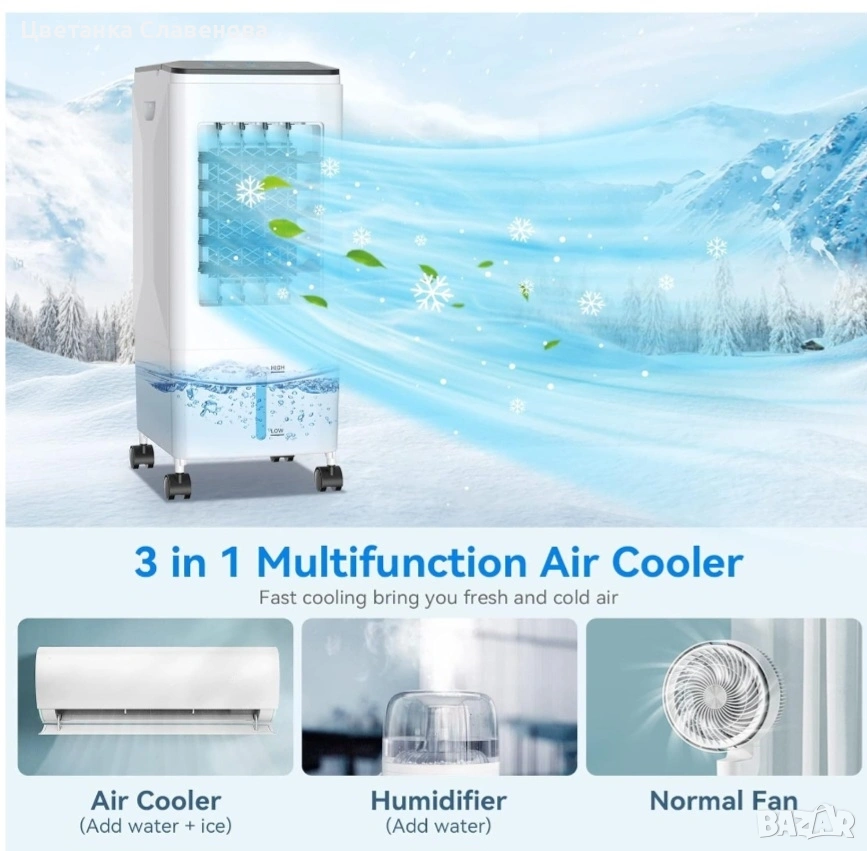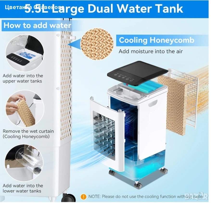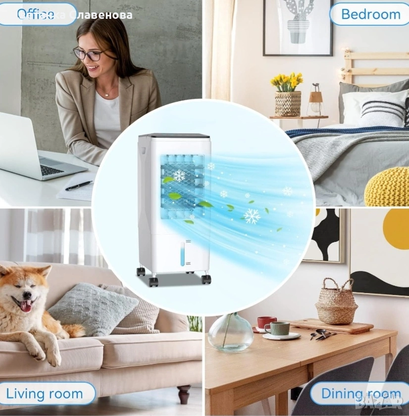 охладител за въздух може да се използва като охладител/вентилатор/овлажнител за климатик с функция за охлаждане, овлажняване и филтриране, за да отговори на всички ваши нужди от охлаждане и вентилация и спомага за намаляване на алергените, праха и дима. Оборудван с 3 кутии с ледени кристали за овлажняване или охлаждане на въздуха; турбо вентилаторният дизайн с голям обем на въздуха и мократа водна завеса ви правят по-комфортни и по-хладни това горещо лято. ! Подходящ за употреба у дома или в офиса!!