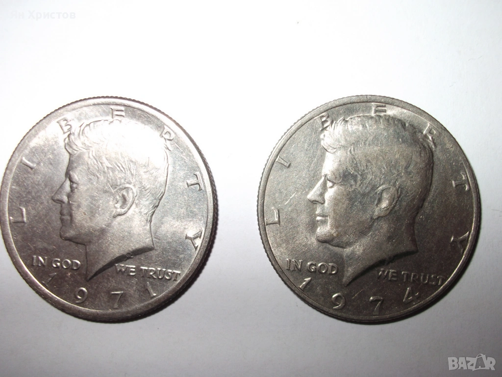 Пет монети от САЩ. 2 по 1/2 долар с образа на Кенеди 1971 г. и 1974 г.