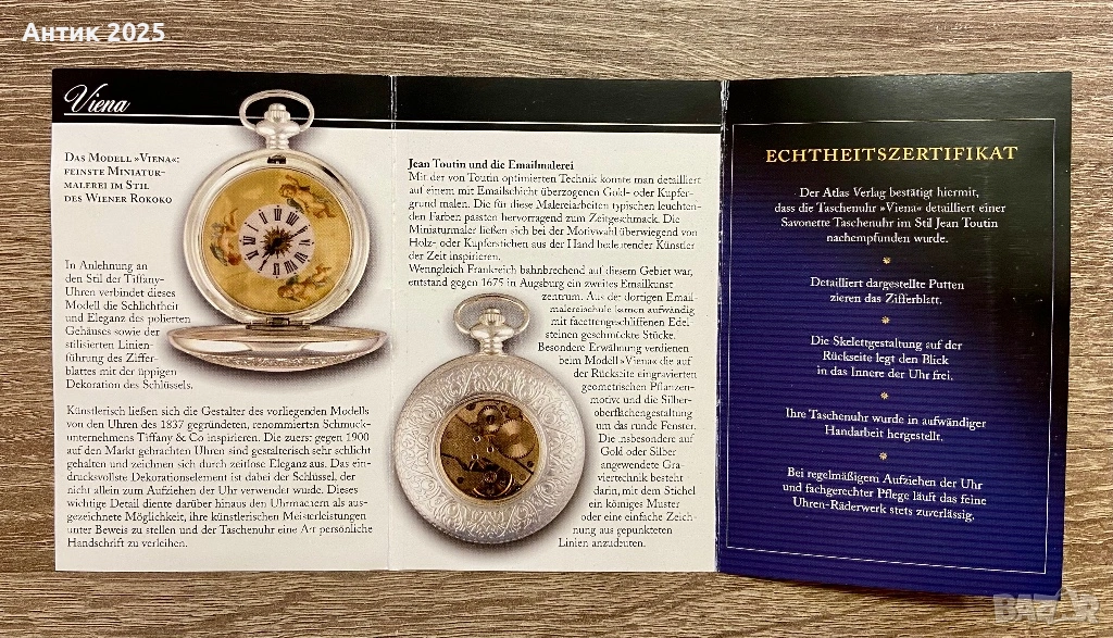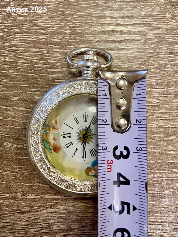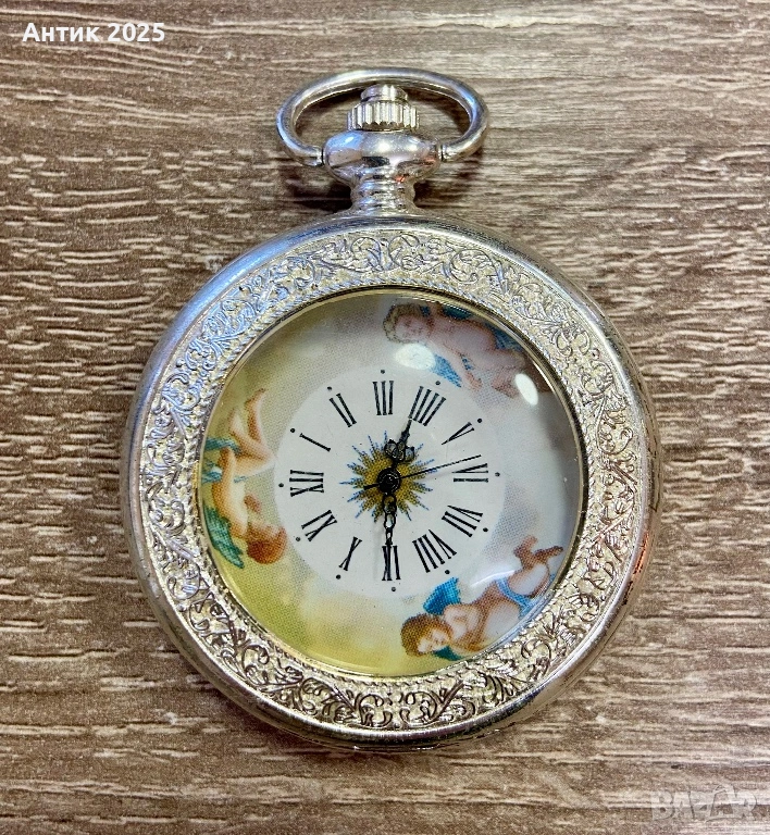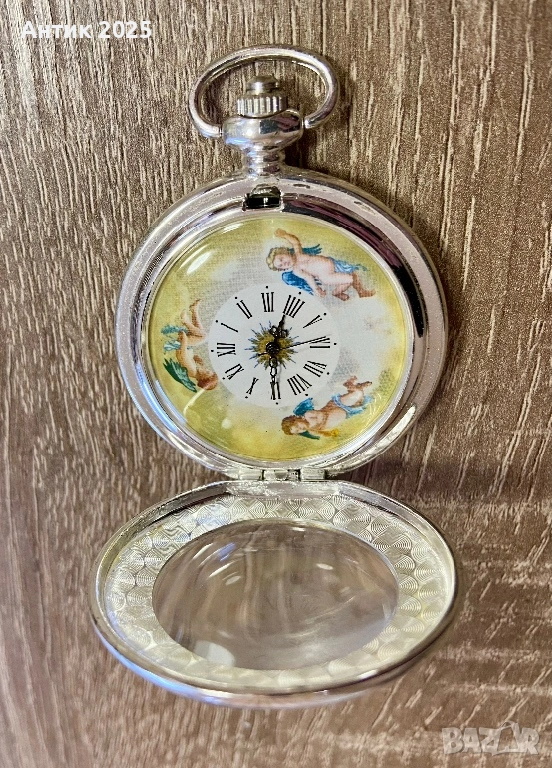 Механичен джобен часовник The Heritage Collection, модел Viena. Механизъм с ръчно навиване. Метален корпус в сребрист цвят с декоративен орнамент. Циферблат с римски цифри, украсен с класическо винтидж изображение на ангели. Часовникът е изработен в ретро стил и е подходящ както като аксесоар, така и като колекционерски предмет.