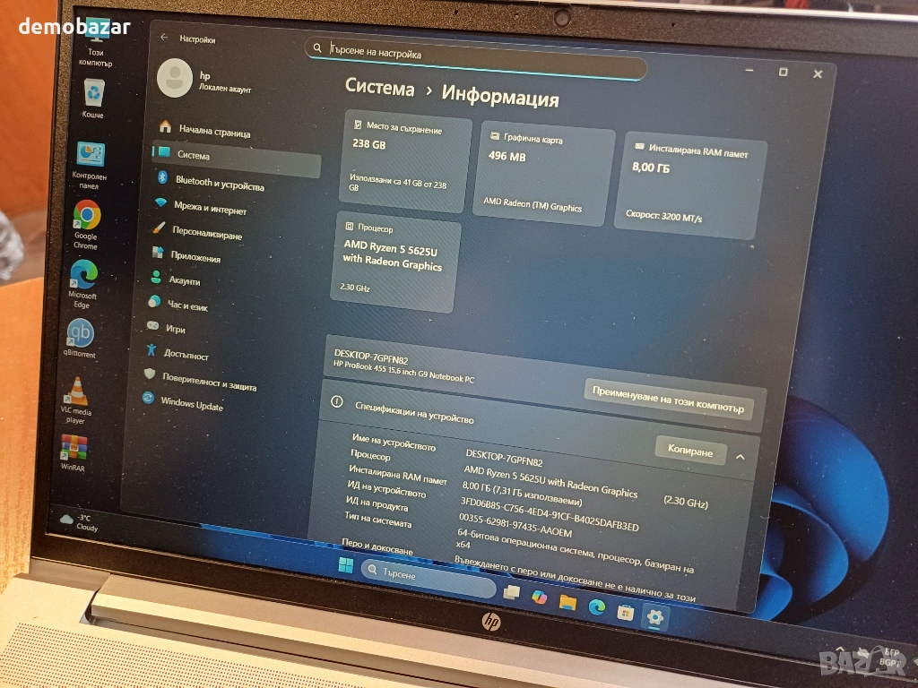 Процесор: AMD Ryzen 5 5625U (2.30 - 4.30GHz, Cache -19M) Cores: 6 Threads: 12