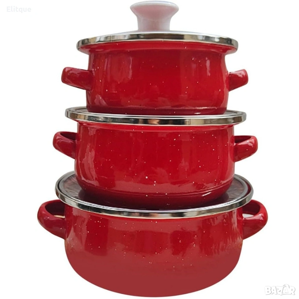 Размери: диаметри 16 см, 18 см и 20 см. Материал: метал с емайлово покритие (външно и частично вътрешно), устойчиво на надраскване при нормална употреба. Подходящи за: газови и електрически котлони; при щадящ режим могат да се използват и на индукционни плотове при наличието на подходяща подложка. Капаци: стъклени с алуминиев кант и удобна дръжка, задържат топлината и позволяват видимост по време на готвене. Почистване: лесно почистване с топла вода и мек препарат; избягвайте агресивни абразиви, за да запазите блясъка.