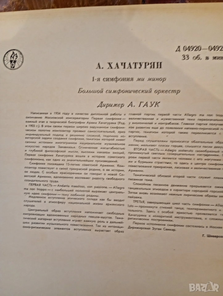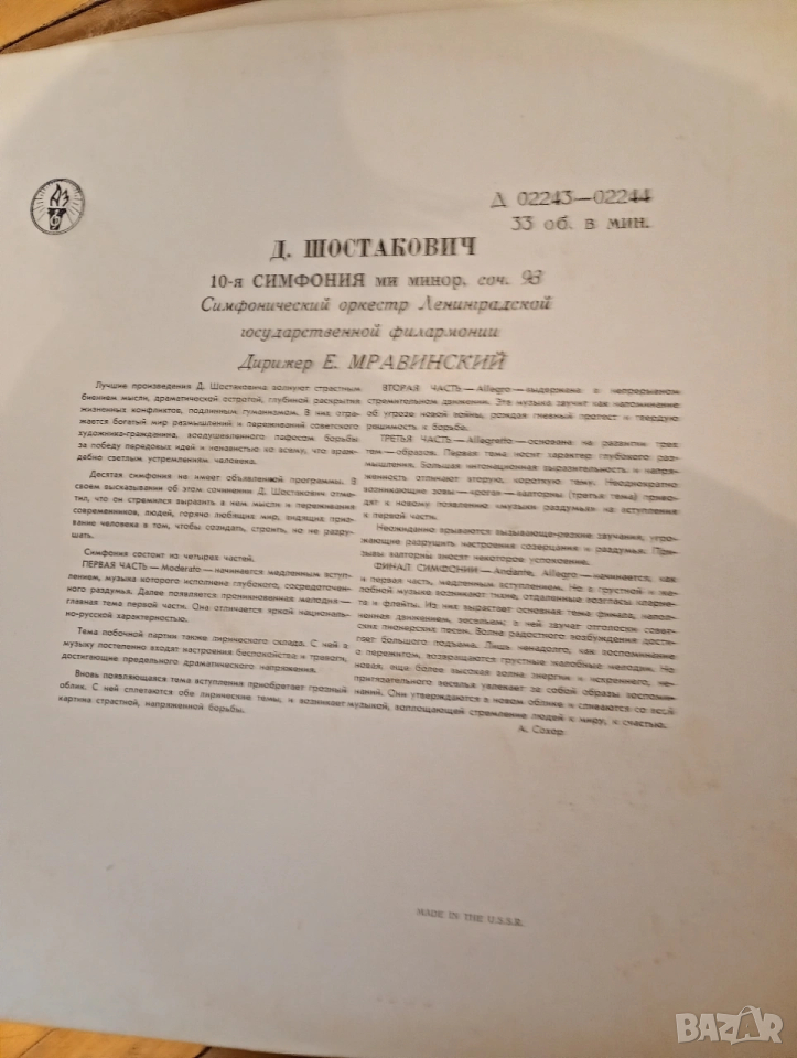 Грамофонни плочи, руски, много добре запазени. както и обложките - Хренников- филмова музика, руски народни песни. концерт на държавния академичен хор, Чайковски -4-та симфония, Шостакович -10-та симфония, Кабалевский-4-та симфония, Хачатурян-1-ва симфония . Пращам по Еконт, за София може лично предаване.