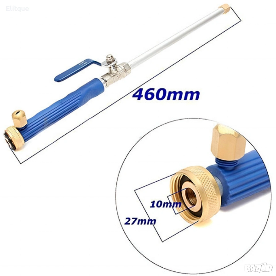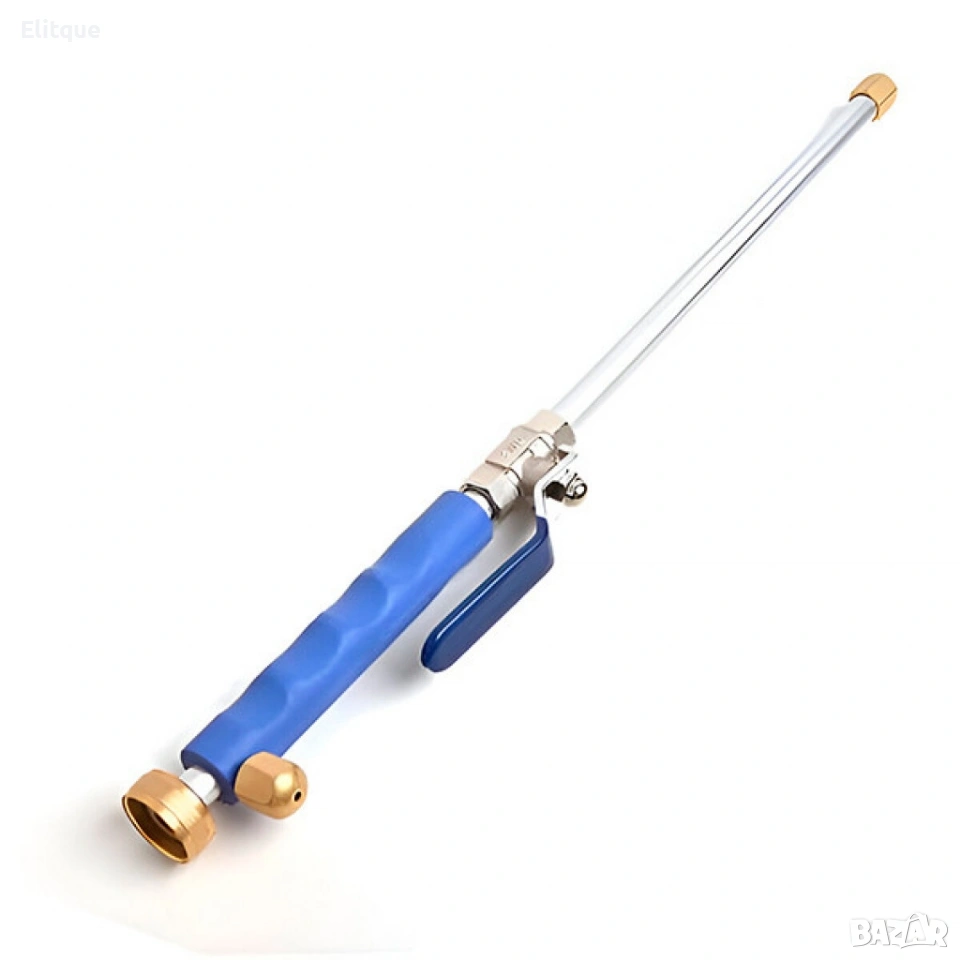 Материал: алуминий, мед Цвят: син Дължина: 46 см Съвместимост: стандартни градински маркучи (конектори 27 мм и 10 мм вътрешен отвор) Функционалност: регулиране на налягането, клапан за контрол, две дюзи за различни режими на пръскане Употреба: почистване на коли, тераси, стълби, огради, прозорци; поливане на градини и морави