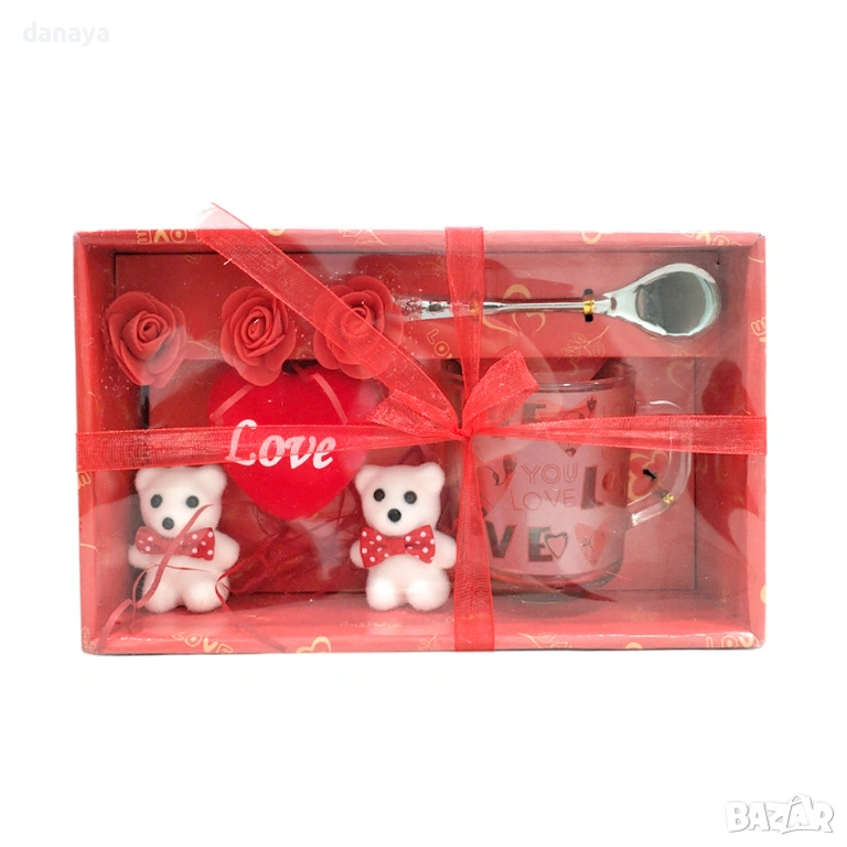 Съдържание: стъклена чаша с надпис Love (около 170 мл), лъжичка, декоративни елементи – 3 броя розички, сърце, мечета