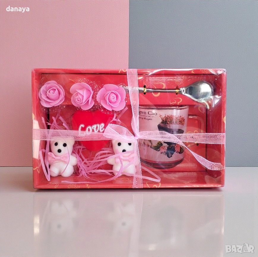 Романтичният подаръчен комплект включва стилна чаша с надпис Love, декоративни елементи във формата на сърце и рози, както и две малки плюшени мечета, подредени в елегантна подаръчна кутия. Подходящ е за подарък за Свети Валентин, годишнина, рожден ден, романтична изненада или жест на внимание към любим човек.