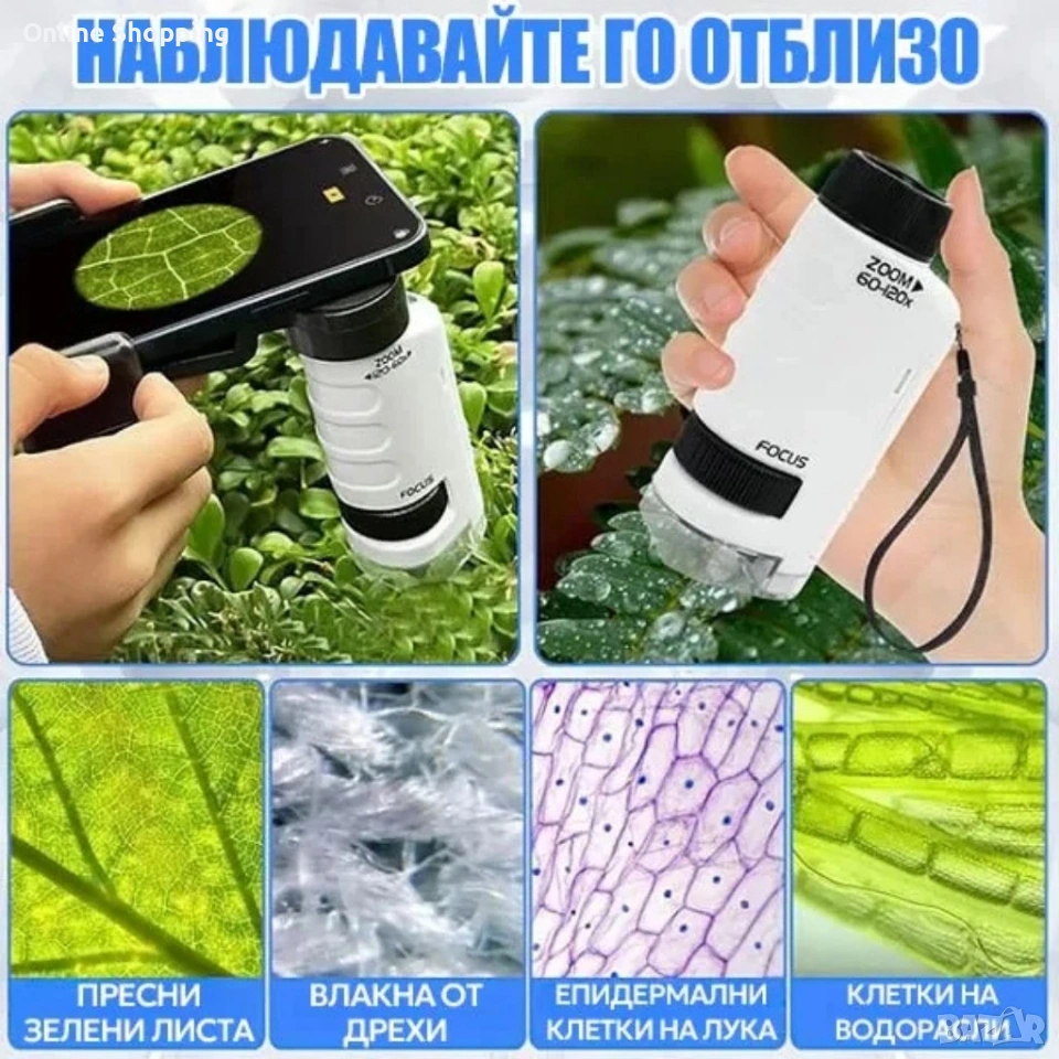 Детски преносим микроскоп с LED светлина, 60x-120x увеличение и стойка за смартфон → Обява 53326910