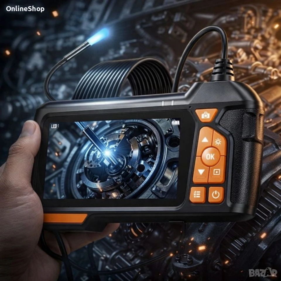 Ендоскопът впечатлява с издържлив ABS корпус и анатомичен захват, който стои стабилно в ръката дори при тежки условия на работа. Контролите са ясно разграничени и осигуряват бърз достъп до основните функции — включване, яркост, зум и заснемане. Камерният накрайник е тънък и гладък, способен да преминава през тесни отвори и да се огъва около препятствия. Дизайнът е създаден да бъде устойчив на прах и влага, а екранът с IPS панел дава наситени цветове и широк зрителен ъгъл, за да не изпускате нито един детайл. Визията е професионална, а изпълнението — надеждно и безкомпромисно.