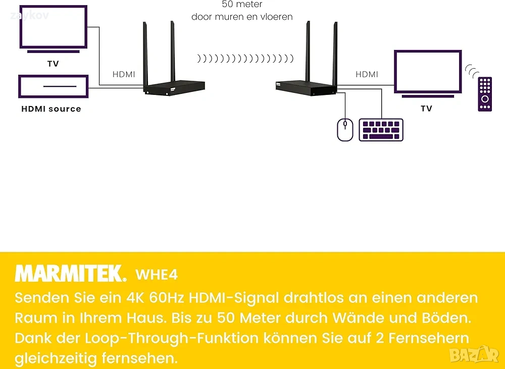 50 метра пространство през стени и тавани – с WHE4 можете да изпращате HDMI сигнала си безжично до друга стая (до 50 метра). Благодарение на 4K качеството, не се получава загуба на качество.