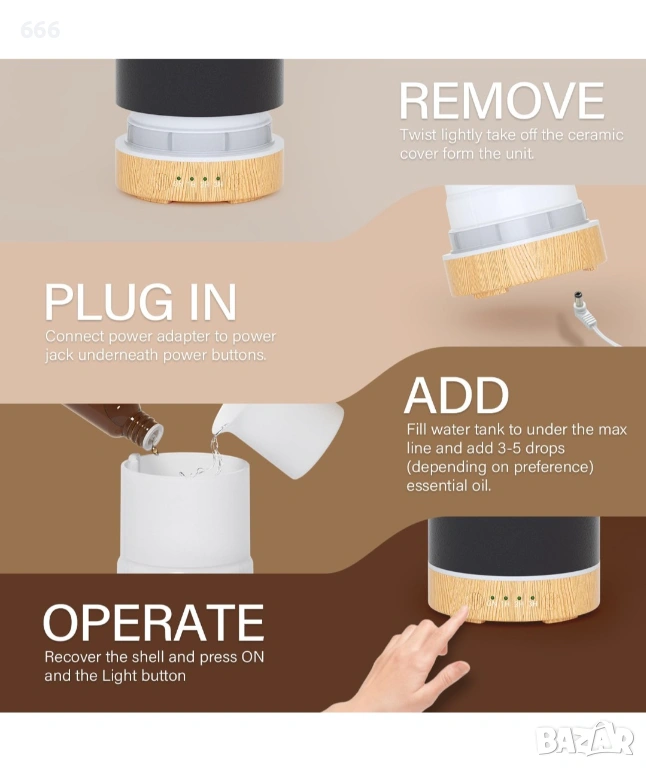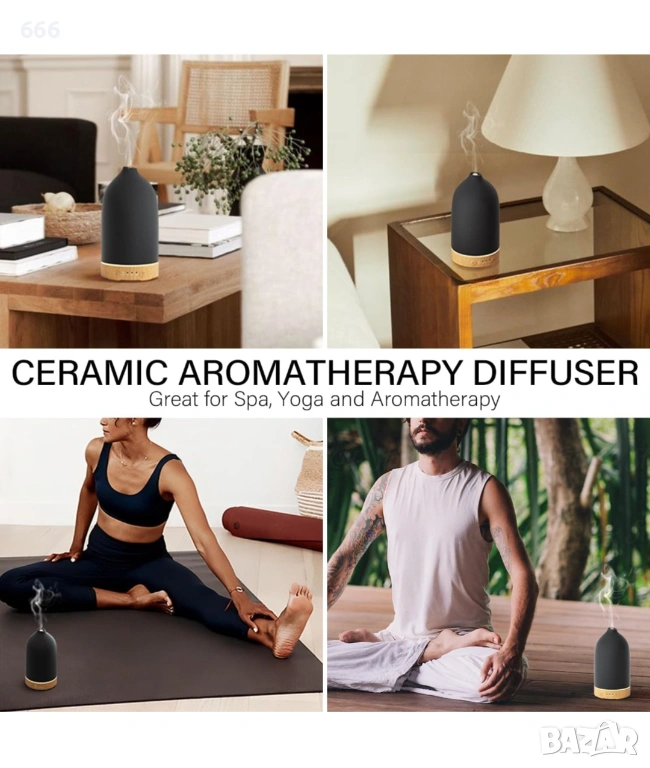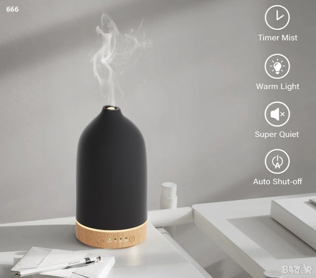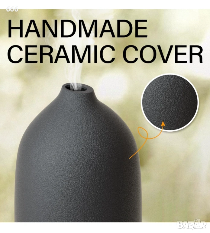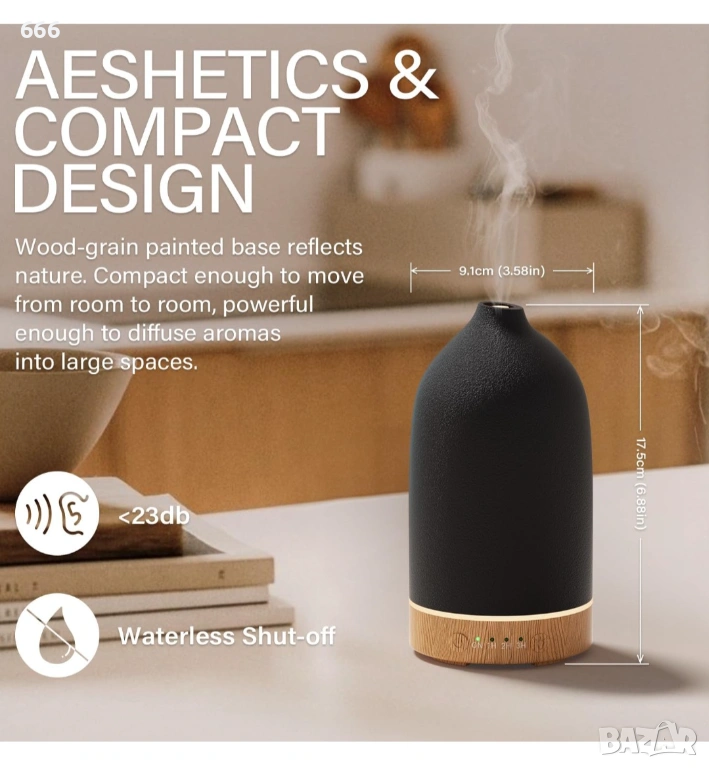 Дизайн с матирана керамика - Ръчно изработеният керамичен дифузер изглежда като произведение на изкуството, а не като ултразвуков дифузер. Класическата основа с дървесен шарен мотив е чудесен начин да покажете своя вкус и стил. С равномерния аромат на етерични масла, той тихо разпространява аромата в пространството, носейки комфортно изживяване във вашия дом, офис или спалня.