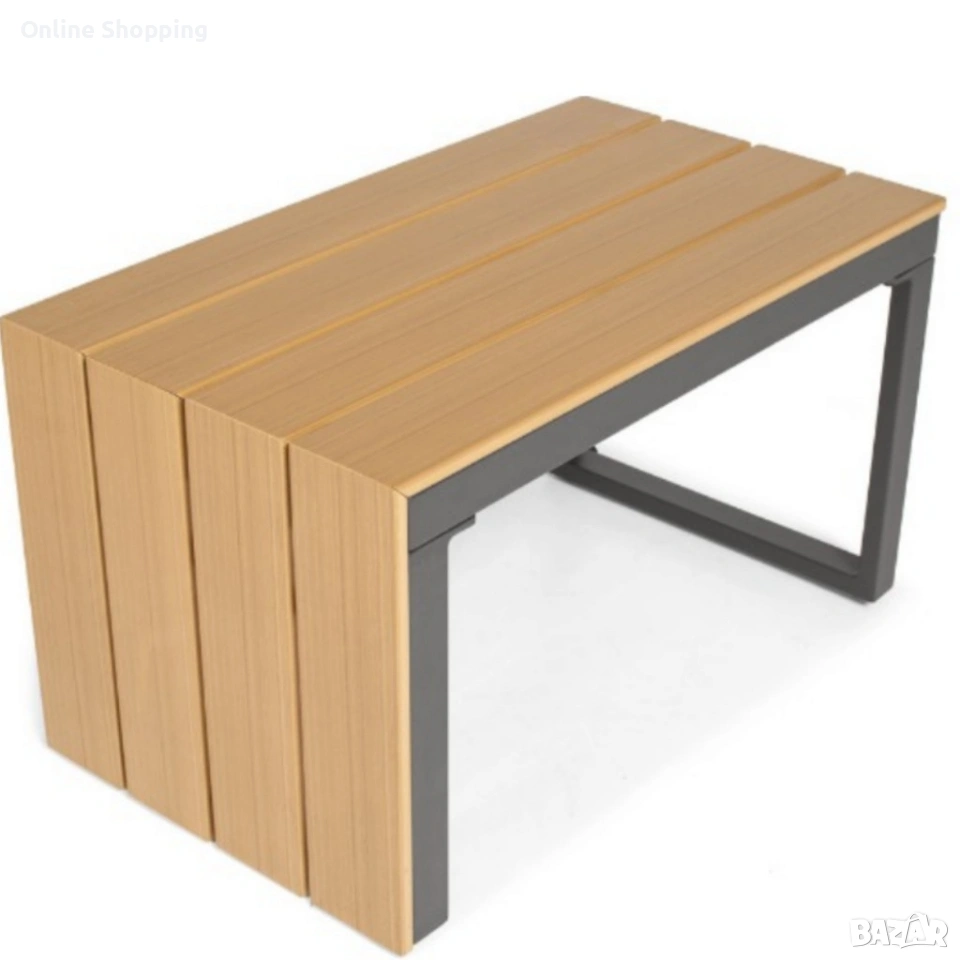 Рамка: прахово боядисан алуминий Плотове: полидърво (влагоустойчиви) Възглавници: висококачествен полиестер, лесен за почистване Товароносимост маса: до 50 кг Товароносимост диван: до 300 кг Размери маса: 70 x 40 x 40 см Размери диван (приблизителни): височина 80 см, дълбочина 70 см, височина на седалката 40 см, дължина 130 см Цвят: сив, с възможност за комбиниране с цветни възглавници