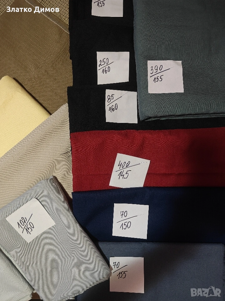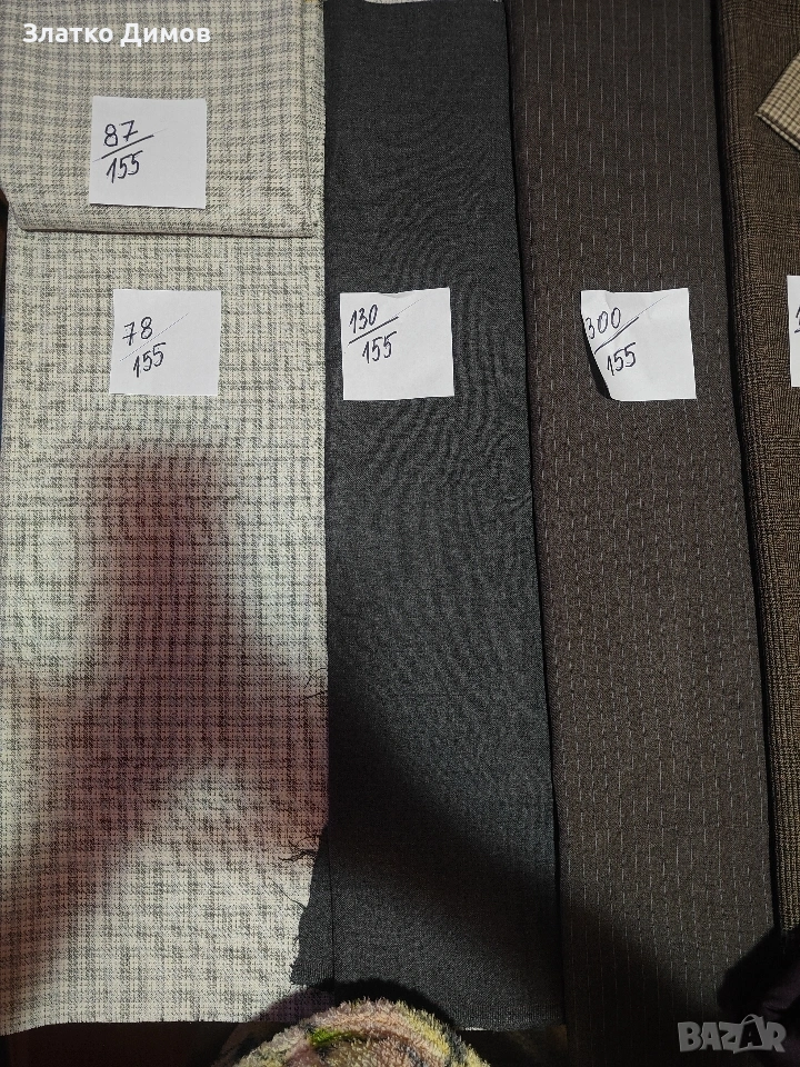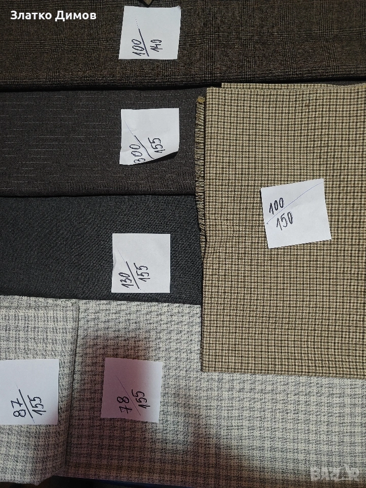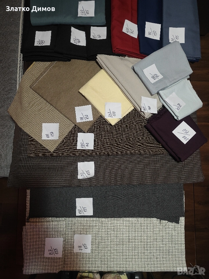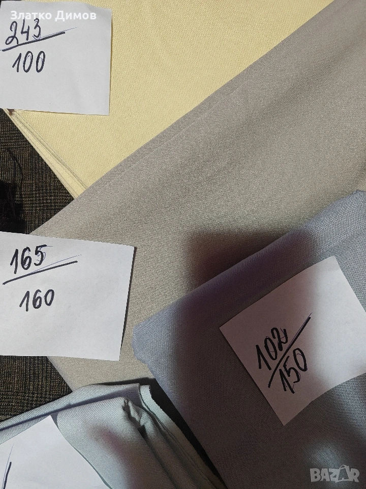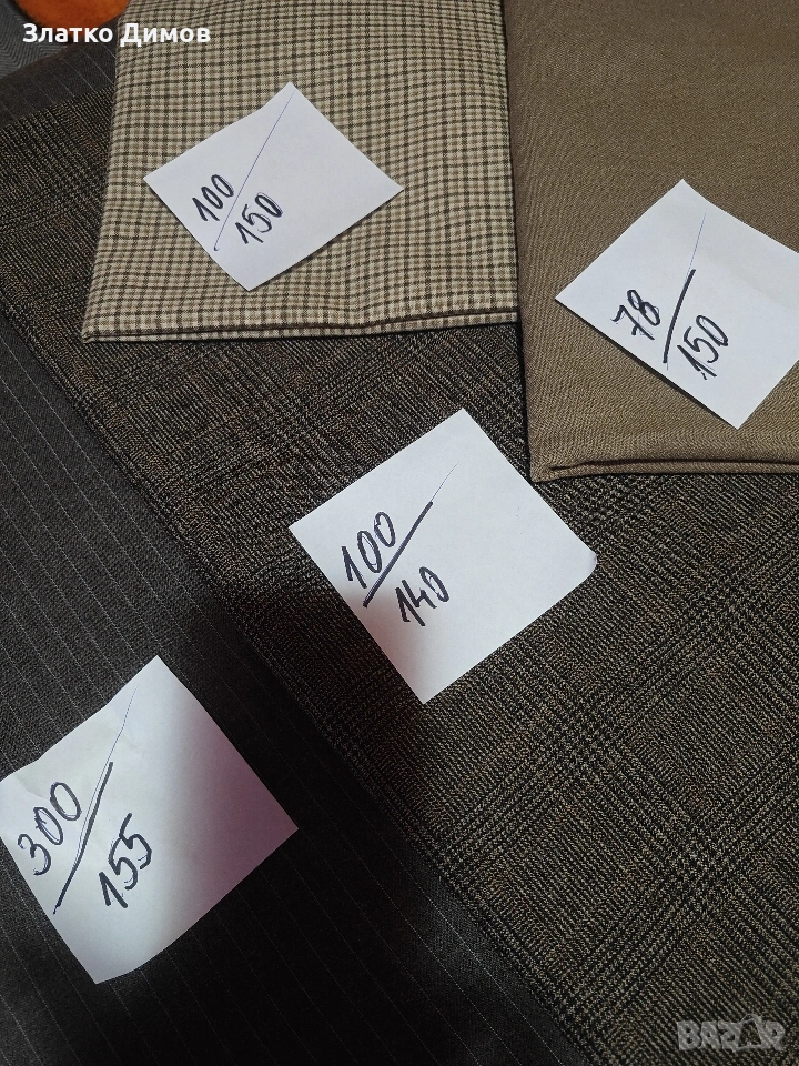 На последната снимка е вълнен габардин на останалите е само габардин.Цената е за метър.На хартийките са размерите . Парчета се продават цели .