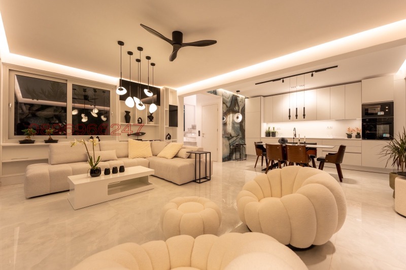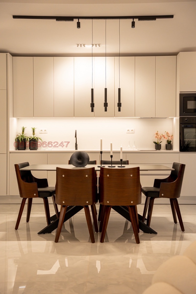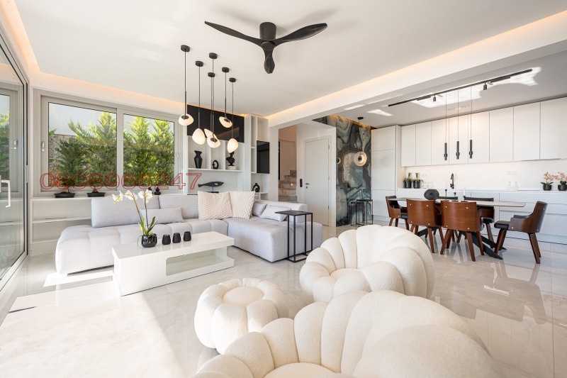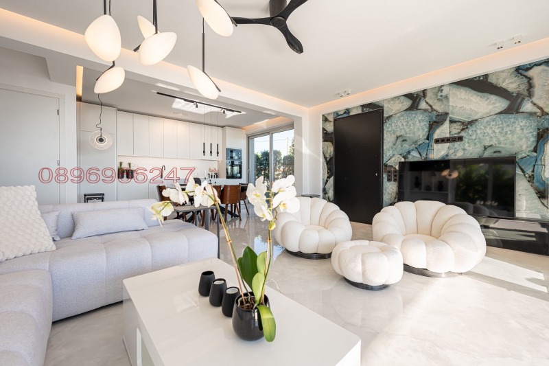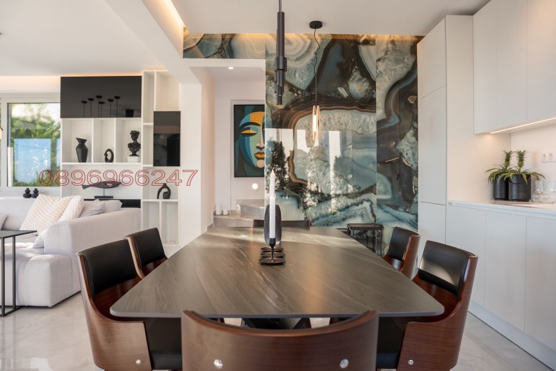 Елегантна и просторна дневна с трапезария и кухня, която предлага впечатляваща гледка към топлото южно море и върховете на Олимп от всички страни.