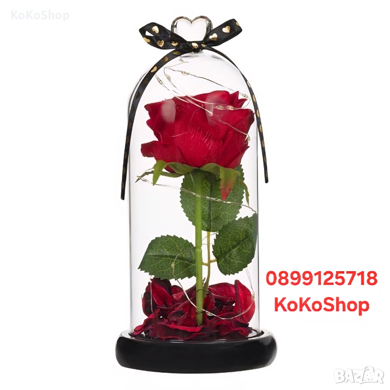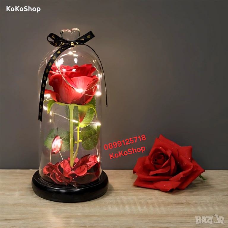 Розата е поставена в прозрачен стъклен купол с кръгла основа и има добавени LED светлини, които създават уютна и романтична атмосфера.