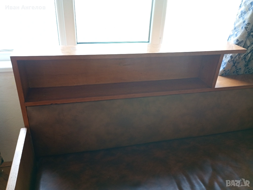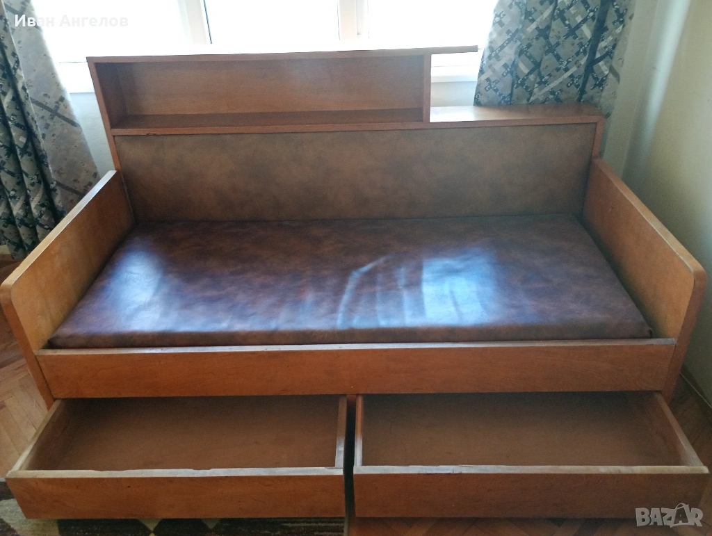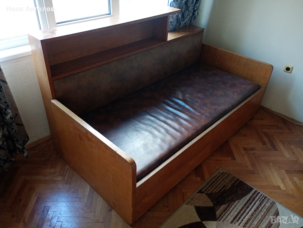 Продавам единичен диван, по-стар модел с масивна дървена конструкция, в много добро състояние за годините си. Разполага с две големи чекмеджета за съхранение. Повърхността е от изкуствена кожа, без скъсвания и напуквания. Диванът не се разтяга.