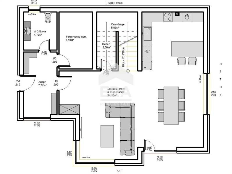 първият етаж (ЗП 101 кв.м.) се състои от антре (7,77 кв. м), просторна и много светла дневна зона, обединена с кухненски бокс и трапезария (54,56 кв. м), тоалетна (4,73 кв. м), килер (2,69 кв. м) и техническо помещение (7,1 кв. м);