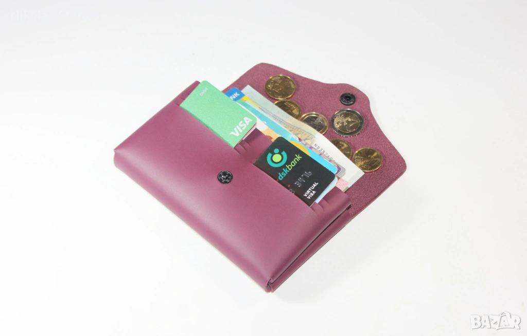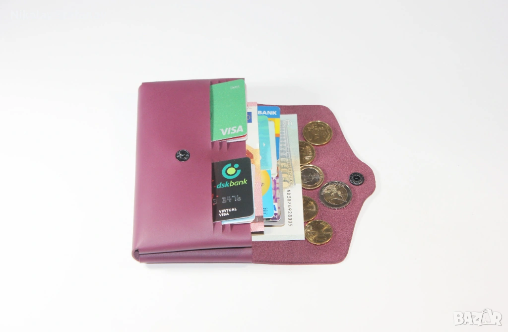 - Разполага с 6 слота за карти, които побират до 12 карти, 2 големи отделения за банкноти, отделение за монети и 2 допълнителни отделения за карти и бележки