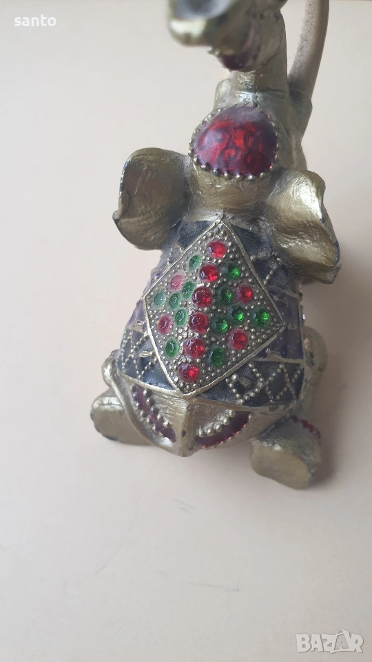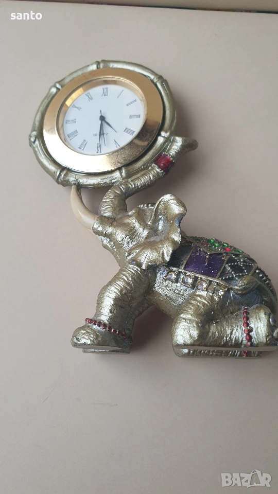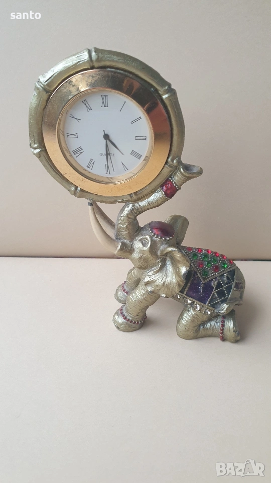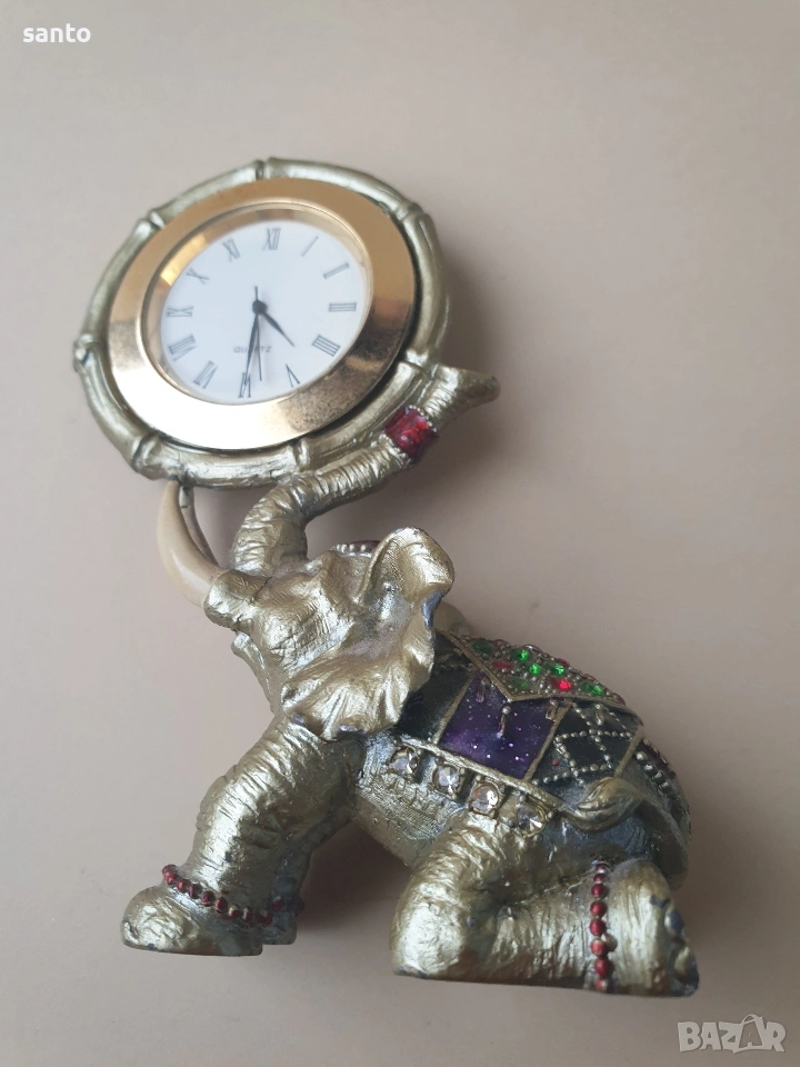 Бронзово слонче,държащо с хубота си часовник.Украсено с цветни камъчета.