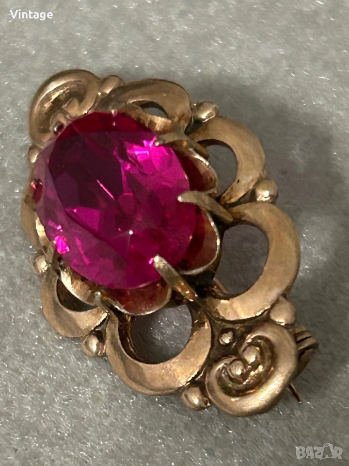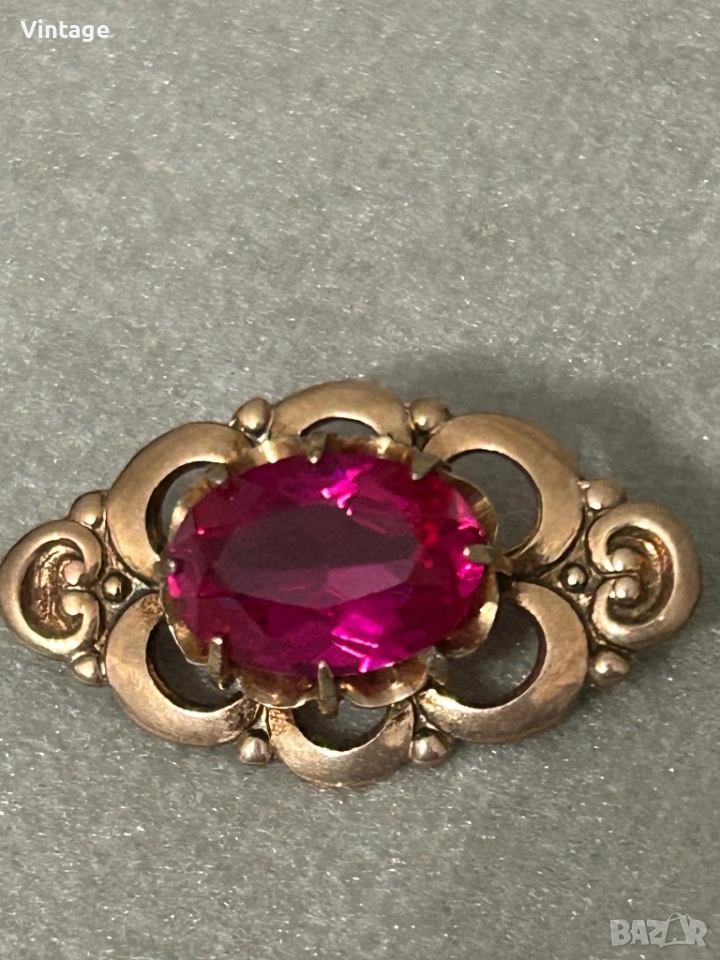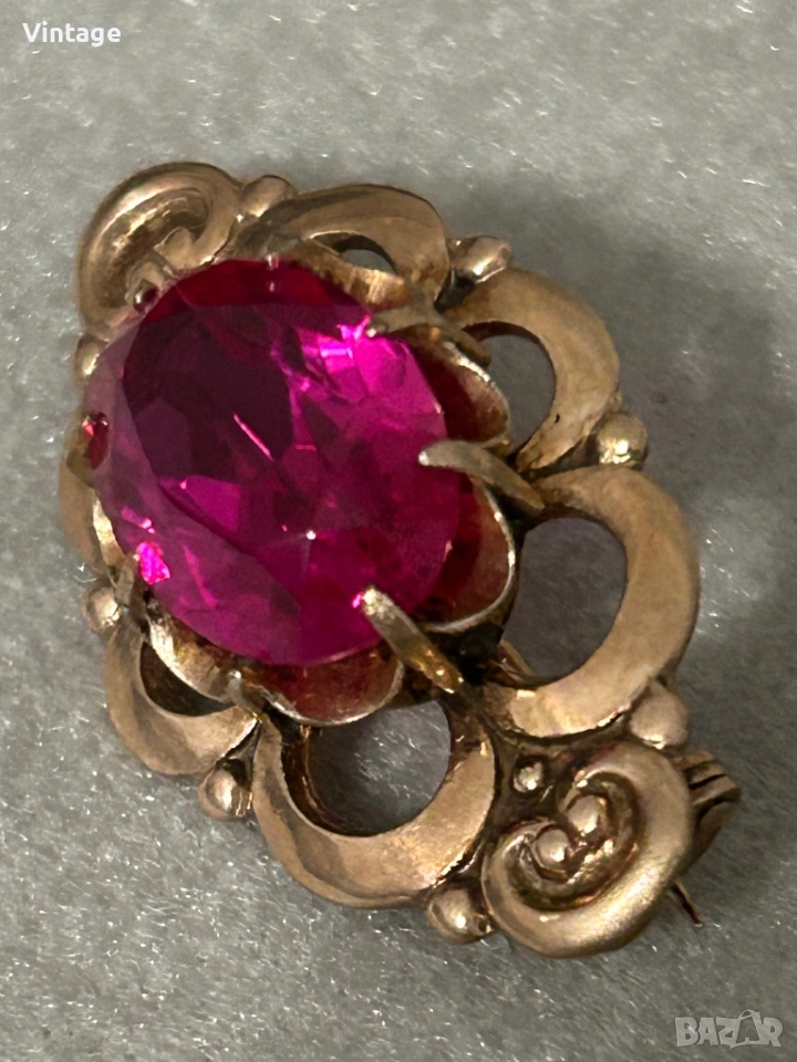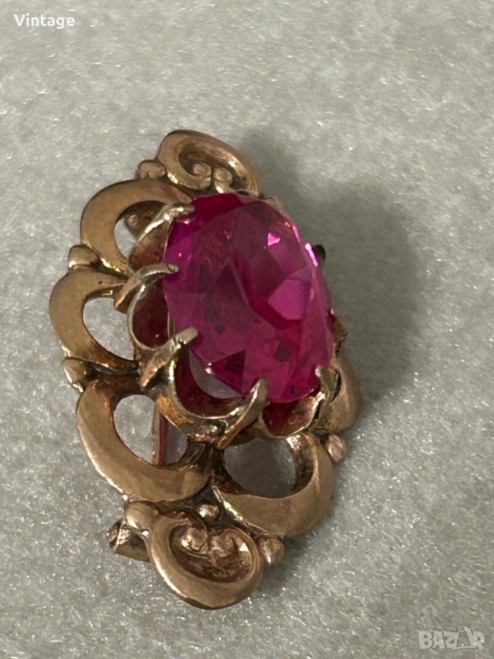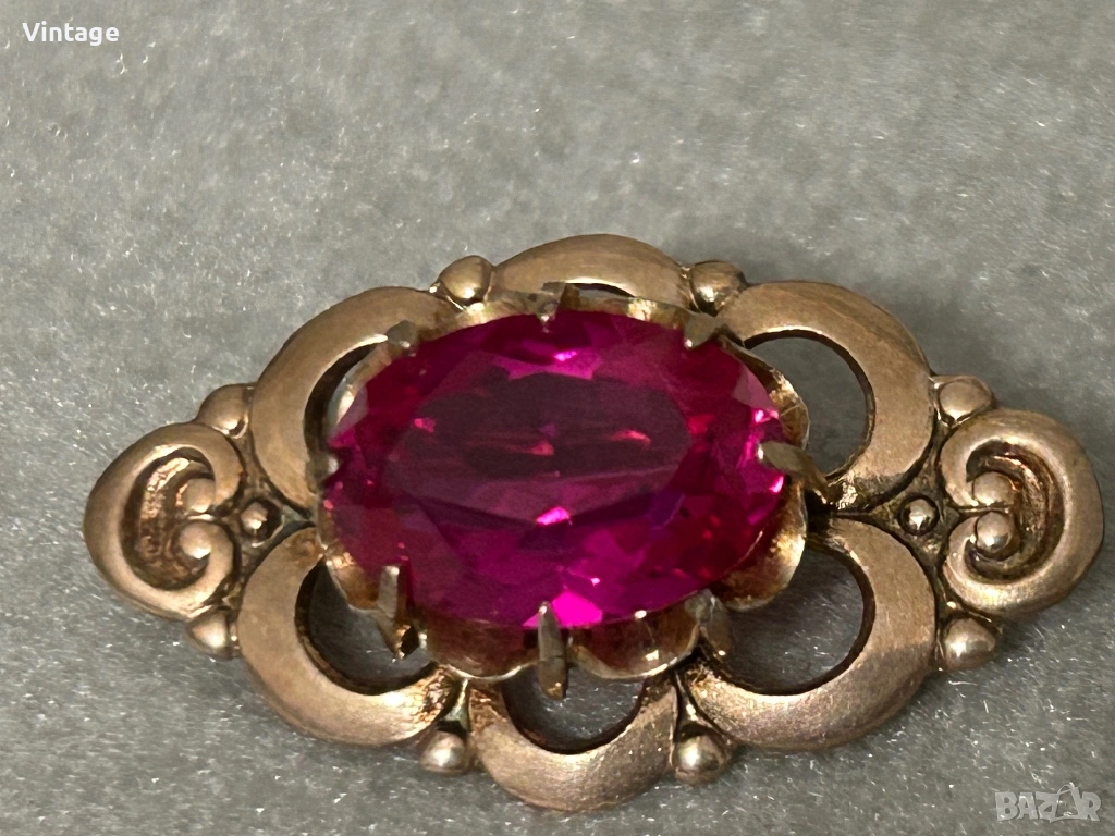 Антикварна съветска сребърна позлатена брошка с рубин → Обява 53328876