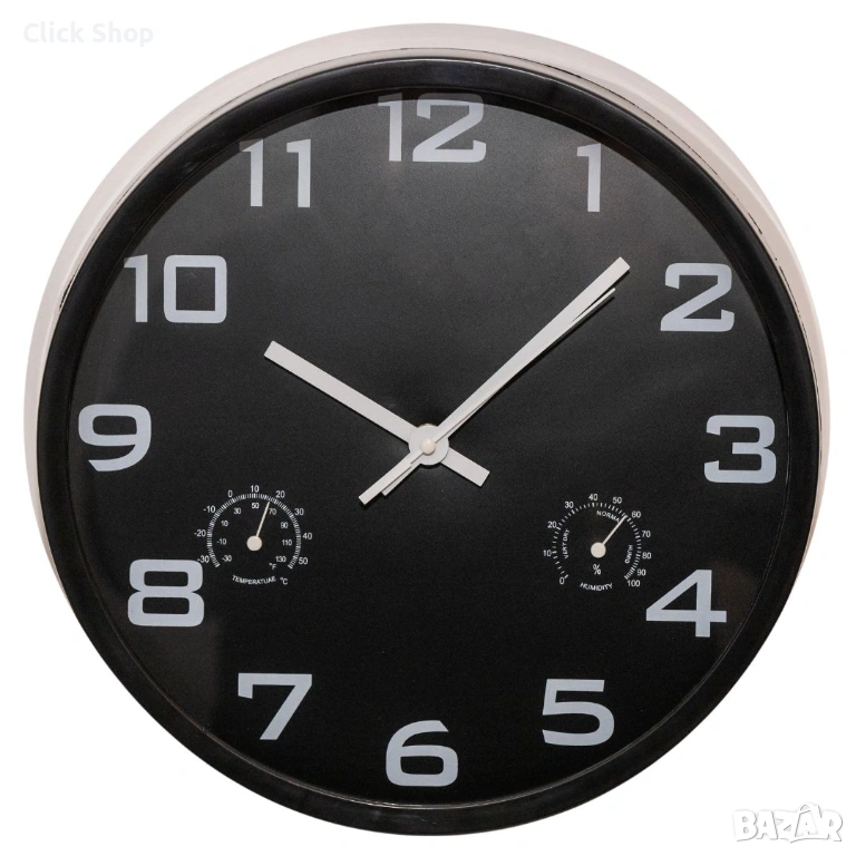 Практичен и стилен черен стенен часовник, съчетаващ модерен дизайн с допълнителни функционалности. Освен ясно четим циферблат с контрастни бели цифри, моделът разполага с вграден термометър и влагомер, които позволяват лесно проследяване на температурата и влажността в помещението.