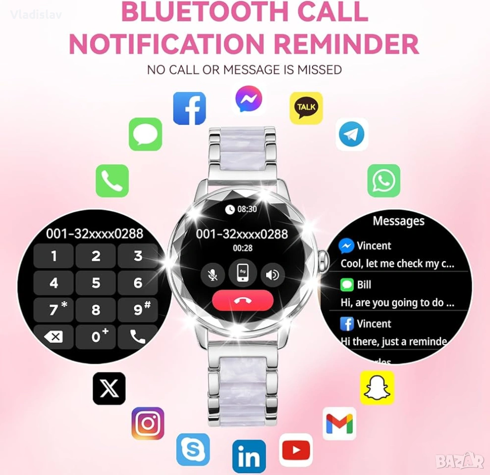 *Свързаност: Часовникът поддържа Bluetooth разговори и известия за съобщения и социални мрежи