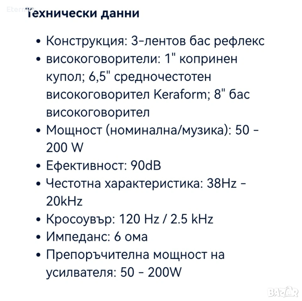 Нискочестотен високоговорител: 8" (200 мм) странично насочен басов високоговорител.