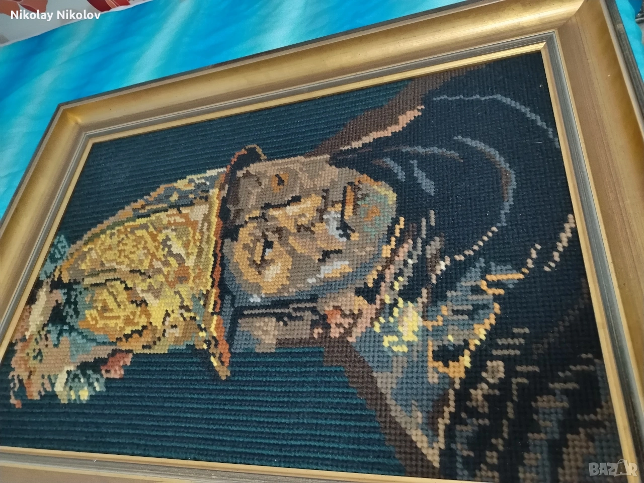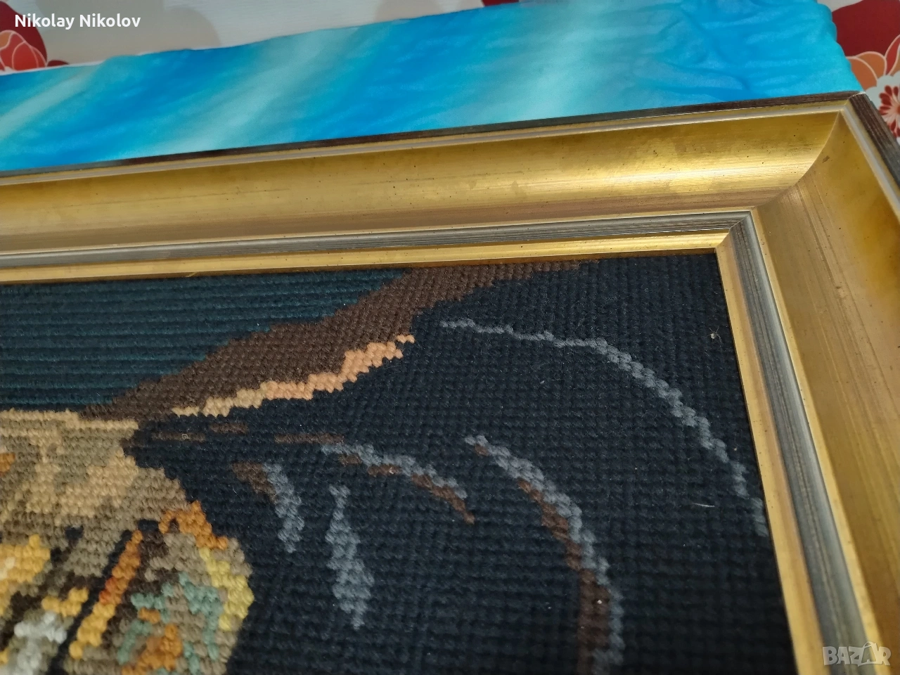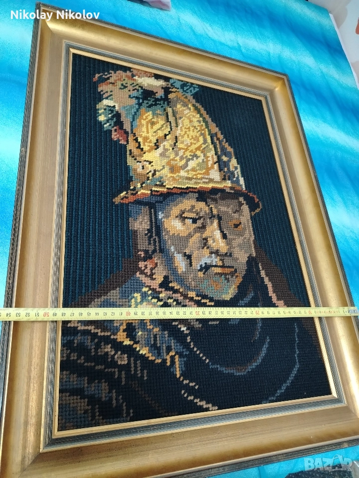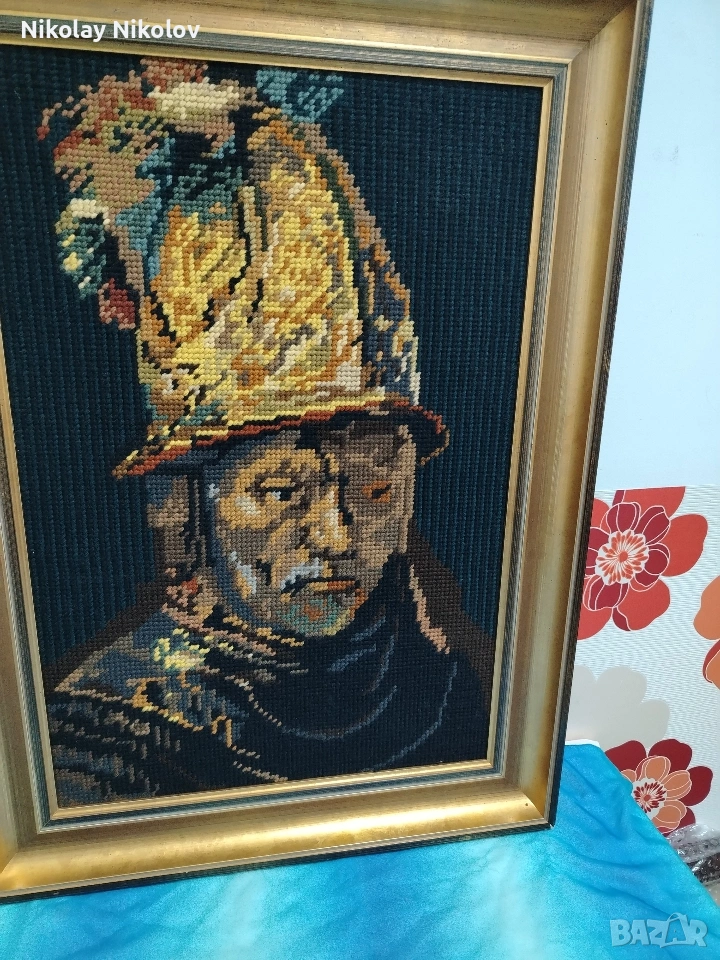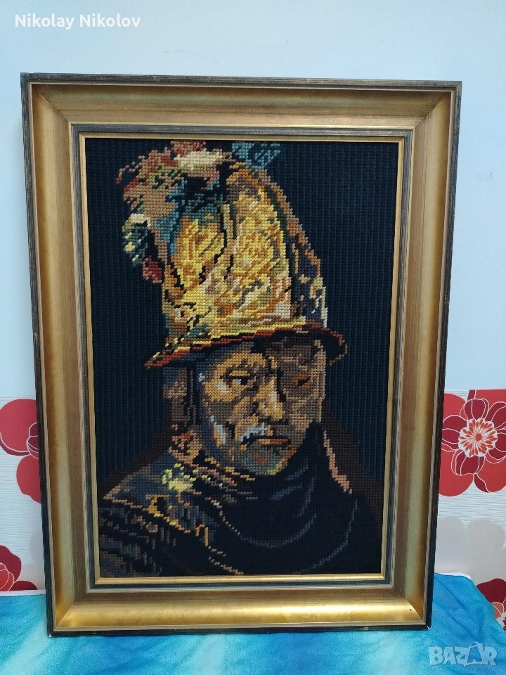 Предлагам прекрасна изработка на гоблен с едър бод по мотив на Рембранд човекът със златния шлем с красиви декоративни орнаменти и цветове размери 75х54